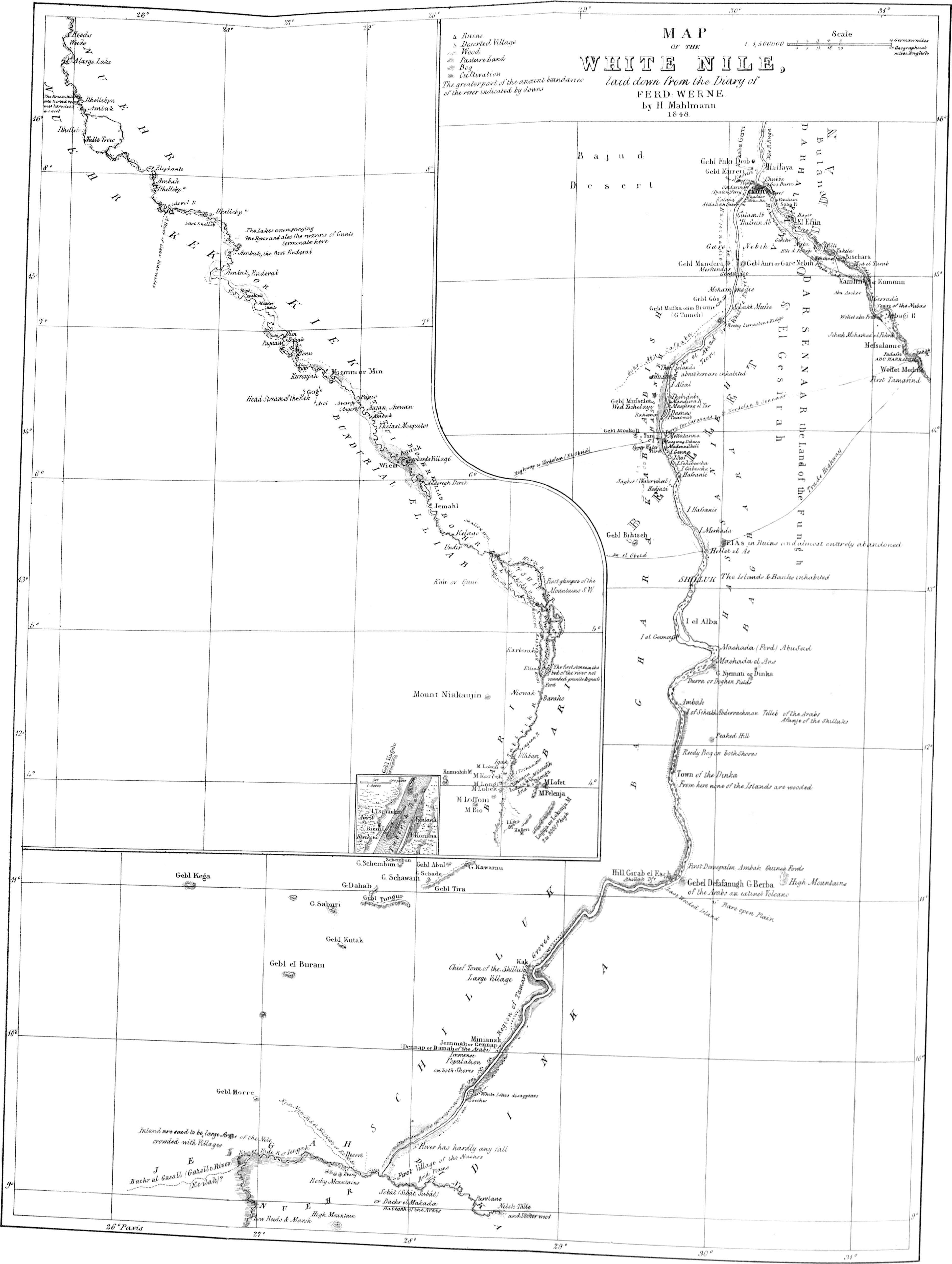 “A Glance at the Country of the Source of the Nile, by C. Ritter, with a Map, Berlin, 1844, and three Supplements—1st, by F. Werne, the Second Expedition to discover the Sources of the White Nile,[v] from November 1840 to April 1841, pages 42-50. 2nd—On Carl Zimmermann’s annexed Chart, to shew the Upper Country of the Nile. 3d—Dr. Girard on the Nature of the Soil of Central Africa on both banks of the Upper Bahr el Abiad, to the foot of the Mountains of the Moon, pages 68-72., principally from the mountain specimens brought home by Mr. Werne.”