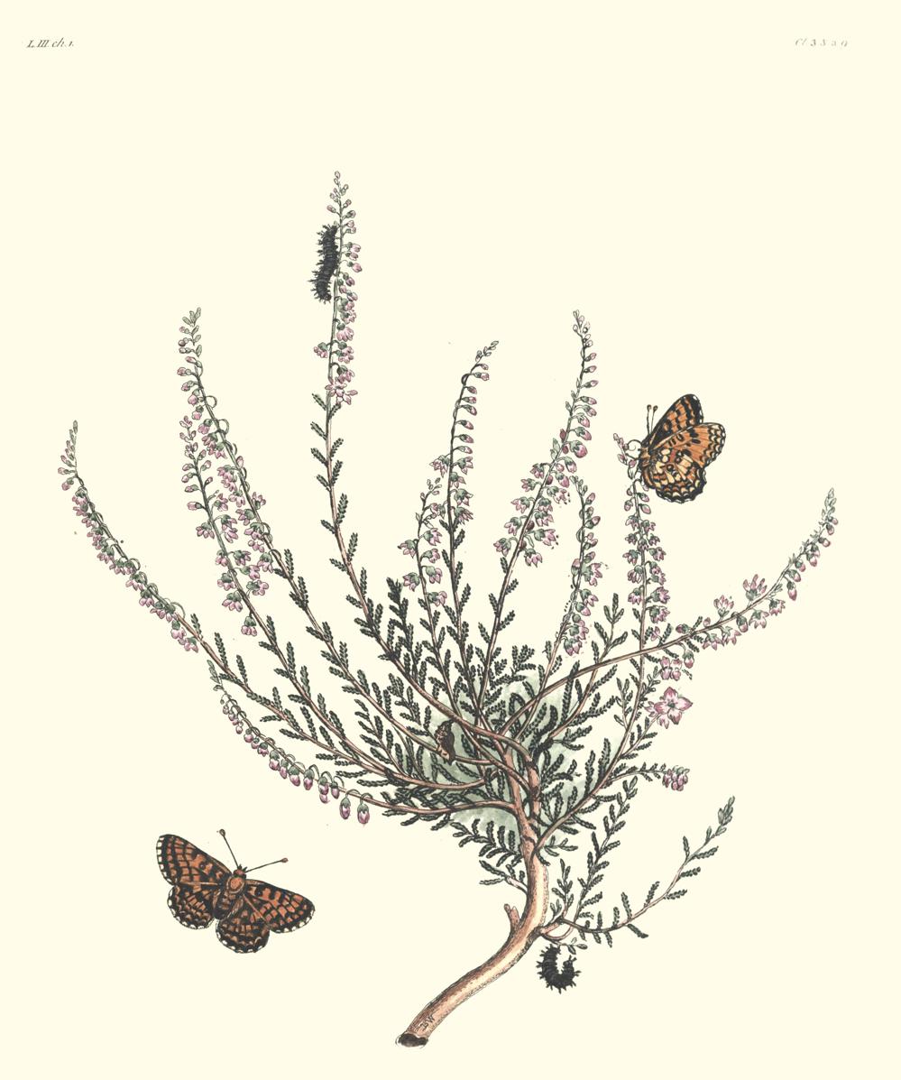The HEATH FRITILLARY-BUTTERFLY. I found the Caterpillars of this Fly feeding on common Heath in Tottenham-Wood, about the Middle of May, 1745, and they are of the same fearful Nature as the last-mentioned. Six or seven of them were feeding near each other, I observed their Manner of eating, which was extremely quick, and when they moved it was at a great Rate. I fed them with common Heath for three or four Days; at the End of which some of them changed into Chrysalis, in which State they remained about fourteen Days, and then the Flies came forth. This Butterfly is very common in most Woods, but its Caterpillar is very rarely found.