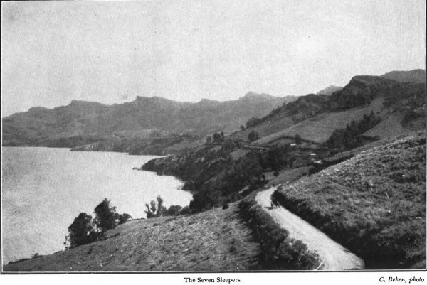 Otokitoki—“The Place of Axes”—is the name of Godley Head, the lofty cliff upon which the lighthouse stands; its early-days pakeha name was Cachalot Head. Working south from the lighthouse we presently come to the deep bay of Te Awa-parahi, where a little farmstead stands in its well-hidden nest, between the lowering peaks. Nearer Lyttelton, just where the Zigzag Road goes over Evans Pass to Sumner, are the precipitous