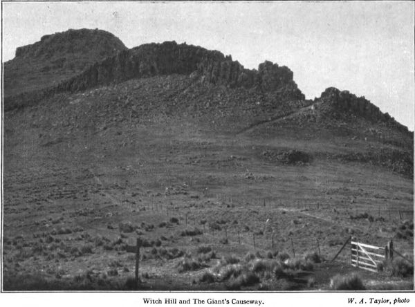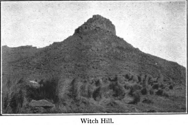 As we travel northward along the Summit Track from the Poho-o-Tamatea, observing from this commanding height—a thousand feet above little Rapaki village, lying in its grassy nest below—how that great spearhead of rock has in reality an almost level top, we come to a remarkable broken wall of grey lava moss-crusted and shrub-tufted, protruding from the grassy flanks of the craggy knoll called Witch Hill. It is in fact a huge dyke of once-molten lava, cutting wall-like through the old lava flows and trending southward across the shoulder of its parent hill. From the very crest of the range it shoots in a palisade of frost-shattered rock, towering thirty feet and more in places above the stone-strewn tussocks, and it stretches some distance in irregular cyclopean steps down the steep slope towards Rapaki. There is an old stone quarry on the face of Witch Hill, where this dyke juts out like a broken castle wall of the Patu-paiarehe , the Dim People of long ago, and just there the old waggon track goes down over the smoothed-out hills to the Canterbury Plains and the green banks of the Opaawaho.