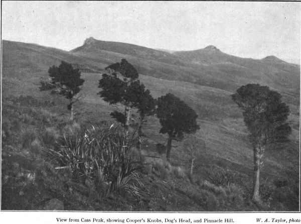 By way of the easy return trail, we work back southward under the upper cliffs. Out near the Pass the crannied walls of old Kahukura echo to the voices of a party of girls, a botany class from the city. The instructor is improving the half-holiday with a practical talk on the native flora, and twenty notebooks are out and pencils busy.