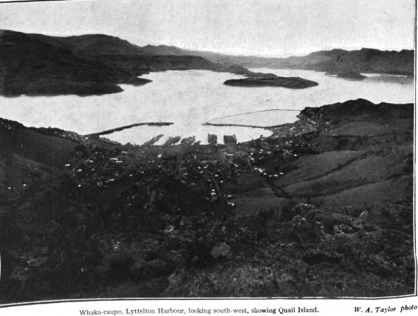Our talk turned one day to the poetic legendary past of the Port Hills above us and the Banks Peninsula peaks yonder, hemming in Lyttelton Harbour in an annular line of dead fire crags. They were the hills of an artist’s dream this golden afternoon, all their asperities of crag and bare bluff softened and gilded by the mellow light of a calm, bright, windless day. There was just the faintest of hazy films drawing over the nearer hills from the waters. The sea below us at Rapaki lay in unbreathing quiet, as soft, as bright and blue as Kipling’s Indian Ocean. The rich purple of distance painted the most remote of the Peninsula peaks, and here and there a wispy tail of mist floated about the head of a gully that cleft the crumpled hills swelling up into the rocky summits of the Pohue and the Ahu-patiki. Just where the land went steeply up from the head of the bay to the shoulders of Te Ahu-Patiki, otherwise Mount Herbert, we could see the curious light grey rock wall of the Tarahaka, above the Pari-mataa, “Obsidian Cliff,” like a great chute down the mountain side, gleaming in the sun, the tipua rock of the fire gods. Nearer, in the middle of the picture, were the black volcanic cliffs, and the green slopes and pine-groves of the Lepers’ Isle, the island which the Maoris of old called Otamahua, mapped by the pakeha as Quail Island; it was one tragic spot in the picture, a place of living death.