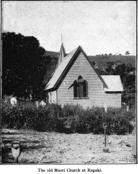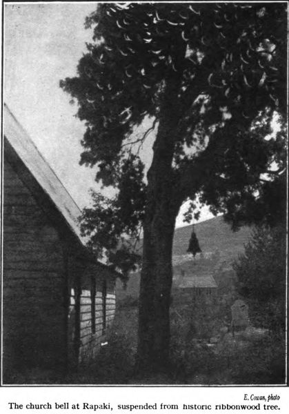 In the little Maori kainga of Rapaki, folded away in a valley-fan of Lyttelton harbour-side, there is a tiny, steep-roofed church, of old-fashioned build, and by the side of this church stands a twisty-branched old ribbonwood tree, that in summer showers over porch and steeple its sweet, snowy blossoms, scented like the orange tree. On the lowermost bough of this knotty ribbonwood, the houhi , or houi , of the Natives, that stood here before the church was built, over fifty years ago, hangs the bell that calls the remnant of Ngati-Irakehu to worship; and it is this sylvan belfry that symbolises for me the intermingling of modernism and ancientry in the Rapaki of to-day. Like the other hapus of the Ngai-Tahu tribe, the Ngati-Irakehu and their kin are now half-pakeha in blood; they have intermarried with their European neighbours, and their little township, with its sixty odd souls, is scarcely to be taken at first sight for a Maori settlement. The communal house, of characteristic Native build, with its carved frontal barge-boards and its gargoyle-like tekoteko perched above the entrance, familiar to travellers in the Native districts of the North, is wanting here; but a survey of the village scheme, with its tree-shaded cottages grouped sociably about the central green space, and the hall and school-house and church, soon makes it plain that here stood an old-time Maori kainga , of totara slabs and raupo thatch, with maybe a tall stockade guarding its landward side and stretching from cliff to cliff of the little boulder-beached bay. The plan is the same; the buildings have changed, for Rapaki to-day believes in[40]