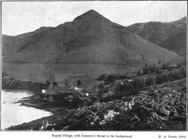 From Tikao, too, we hear something of the poetic legend and nature-myth that steep those swart hills above Rapaki. Yon savage Poho of rhyolite, and the peaked and pinnacled cores of old volcanoes that break through the grassy hills for mile after mile, all have their tales of pre-pakeha years, of which we shall chronicle something again. Just now we may content ourselves with the gentler scenes in Rapaki valley, where the kowhai has shed its showers of gold and the pakeha fruit trees in blossom sweeten the soft air deliciously. That patch of ploughed land behind the settlement before long will show the first shoots of kaanga , or maize; there is not much grown in this island except by the Natives. The water-front, in spite of its smart new jetty for the launches, is lonelier than in the old days; for there was a time, long after the war-canoe era, when three long whaleboats were hauled up on the sand where the boulders are piled aside yonder and often these could be seen pulling down to Lyttelton laden with potatoes, corn and fruit. That bit of beach is over-rough; but a little way to the north, under the lee of a wild bit of a rocky headland thick with beautiful light bush, is a gem of a white beach, clean and hard and shining, a sandy alcove that must have been made for picnicking. And from this hillside turn in the road where we get our first glimpse of Rapaki, we may also most fitly take our sunset farewell of the kainga of an artist’s dream.