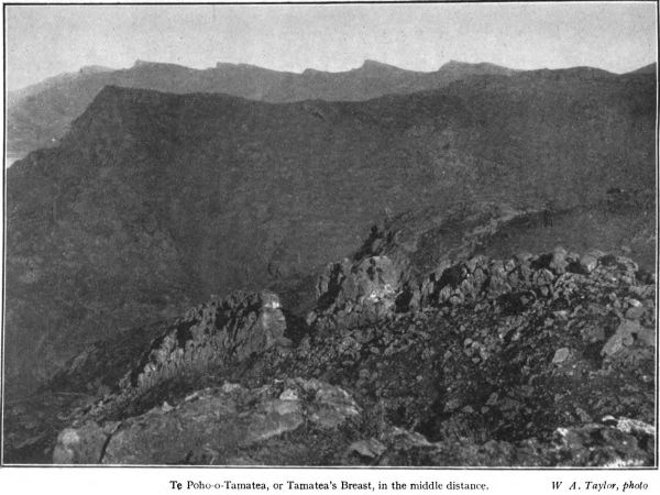 And so, by way of the long Maori story, the one solitary example of volcano-legendry the writer has heard from the South Island, we come to the Rapaki peak’s guardian name, Te Poho-o-Tamatea. The explorer bestowed his name upon the height, tapa-ing it after himself and his sacred breast, much as a present-day traveller justly might claim the right to map-name some peak after himself. Tamatea’s travels led him far after he turned his back on the Port Hills. He marched up on the coast to Kaikoura, and there or further north he built a canoe, or, what is more probable, borrowed or forcibly appropriated one belonging to the tangata whenua who must already have been living in the Marlborough country, and crossed to the North Island. He canoed up the Wanganui River—there is a curious rock, the end of which the natives used to paint red with kokowai ochre, projecting from the eastern bank many miles above Pipi-riki, still known as Tamatea’s Rock—and crossed the central plateau to Lake Taupo, and thence went on to the East Coast. There are innumerable stories illustrating his genius for exploration, and from end to end of New Zealand place nomenclature memorises his travels and justifies the name by which he is known in history, Tamatea-pokai-whenua, or “Tamatea-who-travels-through-the-land.” He was a true type of the pioneer and the path-finder, the Fremont of Aotea-roa and the Wai-pounamu, the man who heard the “one everlasting Whisper”—