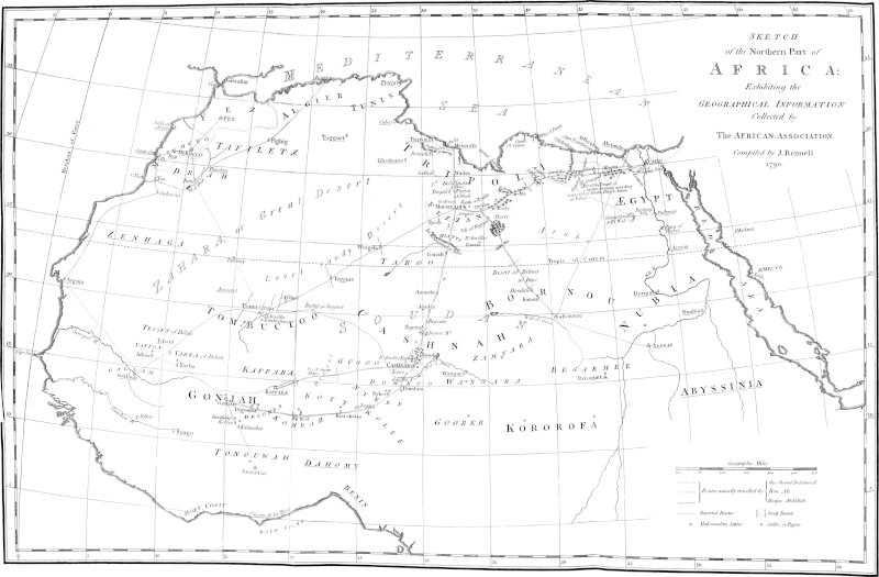 The Society for Promoting the Discovery of the Interior Parts of Africa has been fortunate in collecting much geographical information, in so early a stage of the African researches; and there is little doubt but that in a few years all the great features of this Continent (within the reach of their enquiries) may be known and described. But to accomplish this, it will be necessary that intelligent Europeans should trace some of the principal routes; as well to apportion the distances, as to establish some kind of criterion for the parole information derived from the natives. As yet, in the wide extent of near thirty degrees on a meridian, between Benin and Tripoli, not one celestial observation has been taken, to determine the latitude.