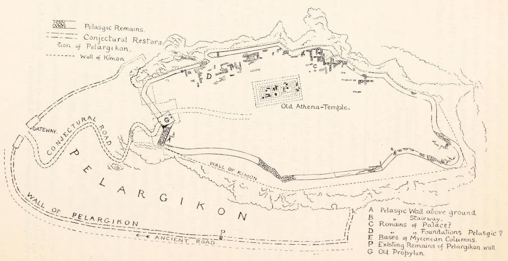 ‘Before this what is now the citadel was the city, together with what is below it towards about south.’ The city before Theseus was the citadel or acropolis of the days of Thucydides, plus something else. The citadel or acropolis needed then, and needs now, no further definition. By it is clearly meant not the whole hill to the base, but the plateau on the summit enclosed by the walls of Themistocles and Kimon together with the fortification out-works[9] on the west slope still extant in the days of Thucydides. But the second and secondary part of the statement is less clearly defined. The words neither give nor suggest, to us at least, any circumscribing line; only a direction, and that vague enough, ‘towards about south.’ It is a point at which the scholar naturally asks, whether archaeology has anything to say?