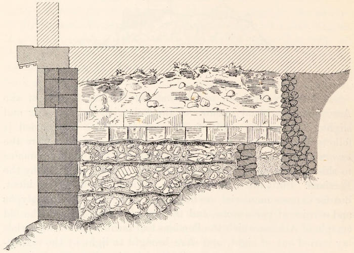The excavations on the south side of the Acropolis have yielded much that is of great value for art and for science, for our knowledge of the extent of the Pelasgian fortification, results of the first importance. The section in Fig. 7, taken at the[17] south-east corner of the Parthenon, shows the state of things revealed. The section should be compared with the view in Fig. 6.