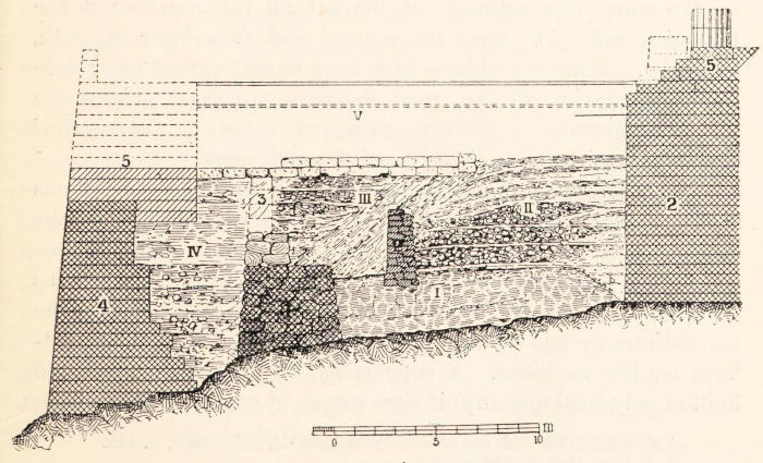 It has already been noted that on the north side of the Acropolis the actual remains of the Pelasgian wall are few and slight; but as the wall of Themistocles which superseded it follows the contours of the rock, we may be sure that here the two were nearly coincident. The wall of Themistocles remains to this day a perpetual monument of the disaster wrought by the Persians. Built into it opposite the Erechtheum, not by accident, but for express memorial, are fragments of the architrave, triglyphs and cornice of poros stone, and the marble metopes, from the old temple of Athena which the Persians had burnt. Other memorials lay buried out of sight, and were brought to light by the excavations of 1886. The excavators[14] were clearing the ground to the north-east of the Propylaea. On the 6th of February, at a depth of from 3-4½ metres below the surface, they came upon fourteen of the ‘Maidens[15].’ The section[16] in Fig. 5 shows the place where they had slept their long sleep. We should like to think they were laid there in all reverence for their beauty, but hard facts compel us to own that, though their burial may have been prompted in part by awe of their sanctity, yet the practical Athenian did not shrink from utilizing them as material to level up with.