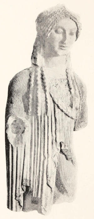 As he passes in eager excitement through the ante-rooms he will glance, as he goes, at the great blue lion and the bull, at the tangle of rampant many-coloured snakes, at the long-winged birds with their prey still in beak and talon; he will pause to smile back at the three kindly ‘Blue-beards,’ he will be glad when he sees that the familiar Calf-Carrier has found his feet and[3] his name, he will note the long rows of solemn votive terra-cottas, and, at last, he will stand in the presence of those Maiden-images, who, amid all that coloured architectural splendour, were consecrate to the worship of the Maiden. The Persian harried them, Perikles left them to lie beneath his feet, yet their antique loveliness is untouched and still sovran. They are alive, waiting still, in hushed, intent expectancy—but not for us. We go out from their presence as from a sanctuary, and henceforth every stone of the Pelasgian fortress where they dwelt is, for us, sacred.