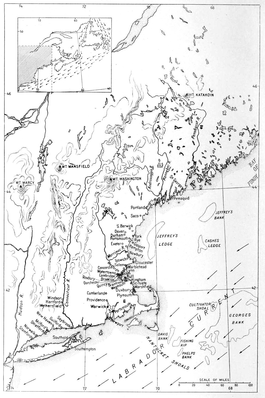In the foregoing sketch, an attempt has been made to trace, very briefly, some of the influences of geography upon Puritan development in New England. The early history of all peoples is largely to be found in their struggle against their environment, and its effect upon them. These effects are subtle and far-reaching, and, in connection with them, it may not be wholly idle to speculate upon what might have been had events followed a slightly different course. Had the Jamestown settlers planted themselves upon the coast of Massachusetts, they would probably have failed. On the other hand, had the Pilgrims and Puritans, as both seriously thought of doing, settled in the tropics, where the nature of the climate and the soil would have turned the scale for slavery, where the conditions of life would have strongly combatted their notions of town and church, and where luxury and easy living would have been quickly attained by their inherent energy, what would then have become of what we call the New England element in our national life? To carry the speculation far would be futile, but it serves to bring out into somewhat clearer relief 14the influences of the geographic environment upon those colonists whose history it is our task to trace.