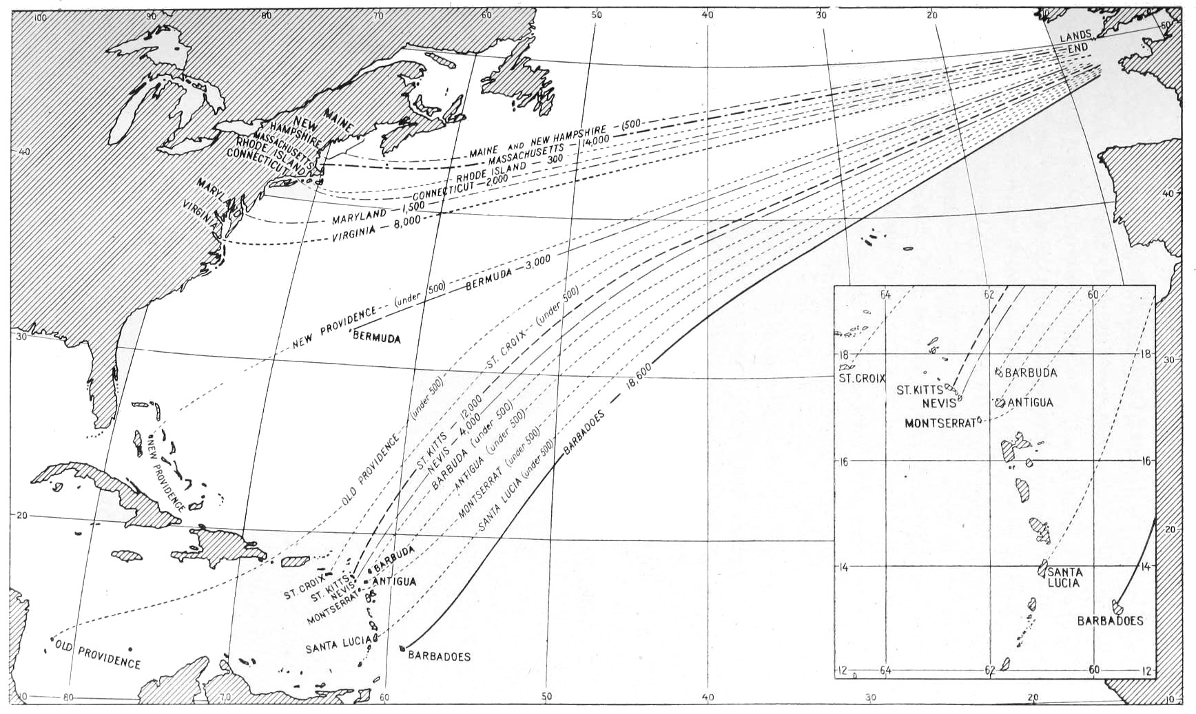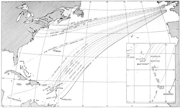 Across this wide expanse, in the latitude of Europe, the currents of both air and water set from America toward the Old World, and almost precluded the possibility, under primitive conditions, of European voyaging and discovery. North of this eastward track, however, lie not only the stepping-stones of the Faroe Islands, Iceland, and Greenland, but, once at Iceland, the prevailing wind carries the European mariner to Greenland, whence the Labrador current leads him close inshore and along the coasts of Canada and New England.[18] To the south of the central eastward track, is the zone of the trade-winds and the great westward flowing equatorial current; and there, again, we find island stepping-stones. Thus nature clearly indicated the two ways by which America might be found; and, for long, the routes followed were the northerly one to the Newfoundland fisheries and New England, and the southerly one to the Canaries, the West Indies, and, thence, to Virginia. The earliest English efforts at colonization in North America were at the two points lying nearest to England by wind and ocean current.