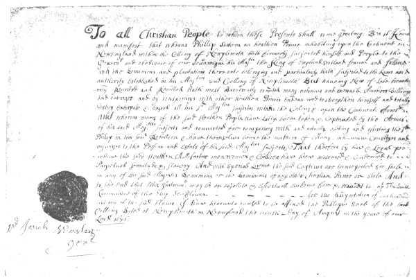 | Warrant signed by Governor Winslow of Plymouth for the Sale of Indian Captives as Slaves | 360 |