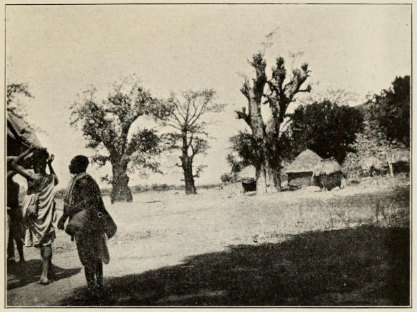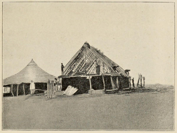 In some parts of the country tents are seldom necessary, as there are rest-houses at all the halting-places on the main roads, and very delightful they are to spend a day or two in, when they are watertight and in good repair—simply shelters, with a very deep, low, thatched roof coming to within four feet of the ground, no walls (grass ones can be added by the villagers in half an hour, if desired), cosy, yet airy from their great height, very roomy, and usually watertight; though, to ensure this, when there is rain about, it is a good thing to pitch the outer fly of a tent over your bed, thus securing a dry, comfortable night, even in a tornado. In a few places, where the rest-house is placed in a forest clearing, outside the village, it seems rather confiding to sleep so insecurely, but I have been told that a lamp and mosquito curtains will daunt any but the hungriest lion.