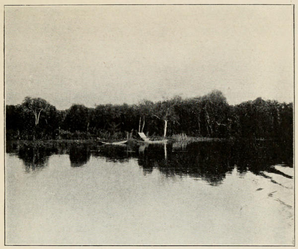 That evening we dined on board the Jebba, which was lying at Burutu, and, later, embarked on our little stern-wheeler, and set out on our river journey, under a full moon, threading our way along one of the labyrinths of creeks—a liquid silver path, walled on each side with straight lines of mangroves, dense black shadows, and weird, bare white roots and stems—a scene suggestive of mystery, and full of a strange beauty of its own.