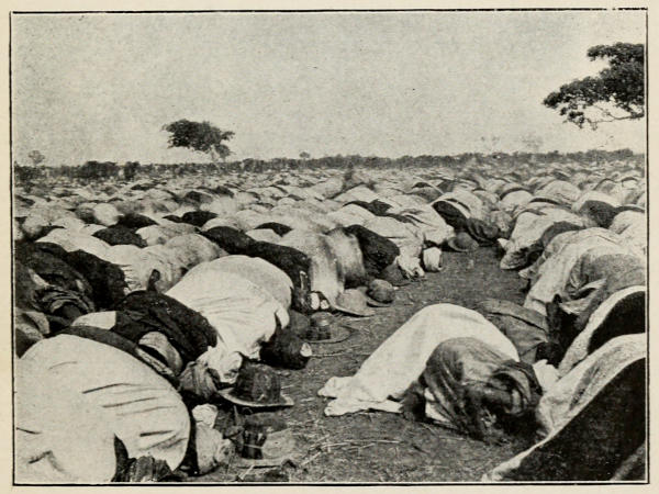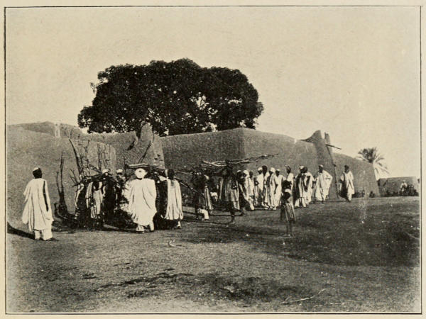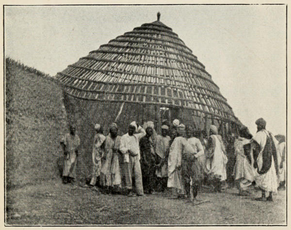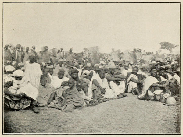 The evening stroll at sunset is always full of interest for me. There is the village to inspect, cloth-making and cotton-spinning to admire, and, perhaps, many little trifles of Hausa leather work, etc., to buy. In places where a white woman has[285] never been seen before, she may cause a panic among the simple souls. In one remote little Pagan village, I remember, the men came, as usual, headed by their Chief, to the ‘palaver,’ and, at sight of me, they fell prostrate, covered their heads with their flowing garments, lay on the ground and moaned in fear, refusing to be comforted till I retreated from the scene. I have since discovered that an occasional albino negress (truly, a fearsome sight) is held by them in great reverence, and practically worshipped!