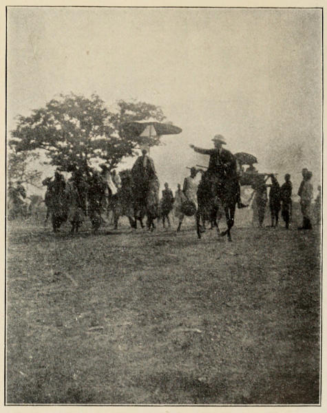 Once shaken down into the routine of marching, you will elect to get up at dawn, your toilet will take about twenty minutes, and a simple breakfast, consisting of coffee and eggs, or grilled chicken, should then be ready. During breakfast, the carriers will pounce upon, and whisk away, the whole contents of the camp, and in less than an hour from the time you woke the long line will have streamed away into the distance, the head-man having instructions where to pitch the next camp, and to have a good supply of water and fire-wood ready. Your better half will probably have a little work to do, in the shape of a final interview with the Chief of the place, so the carriers can always get a good half-hour’s start.