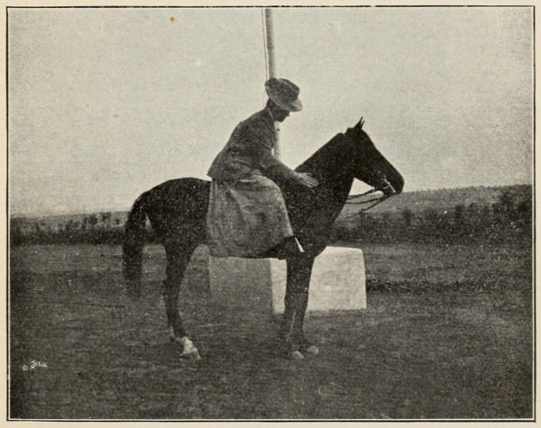 For those wise women who adopt the ‘astride’ position, a divided skirt is, of course, necessary. The very best is, I believe, made by Ross of Bond Street, but that, being the perfection of cut and smartness, is, naturally, an expensive investment, and for rough work in this country an ordinary divided bicycling skirt would answer perfectly, or else full bloomers worn with shooting boots and putties and a rather long-skirted coat—personally, I should advocate the latter.