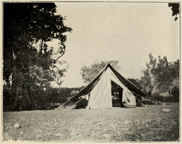 We will suppose, you are able to provide yourselves with two 80 lb. Regulation Officer’s tents; Government supplies one, and you would do well to bring a second as a private possession: one tent is quite too small for two people, and it is a pity to lose so much comfort for a detail so easily carried out. Have them pitched one behind the other, the front one to serve for meals and daily occupation, the back one as sleeping quarters. You can always get a small, roofless attachment, with matting walls, erected in a few minutes, at the back of the sleeping tent, to act as a bathroom. At times, when we felt fairly secure from possible rain, we pitched the outer fly of the front tent in front again; it is quite a simple matter, with the aid of a few extra poles, supplied from the village, and extends one’s quarters[276] delightfully, for a stay of any length, if the camp is in a shady spot—otherwise, of course, it makes the tents warm.