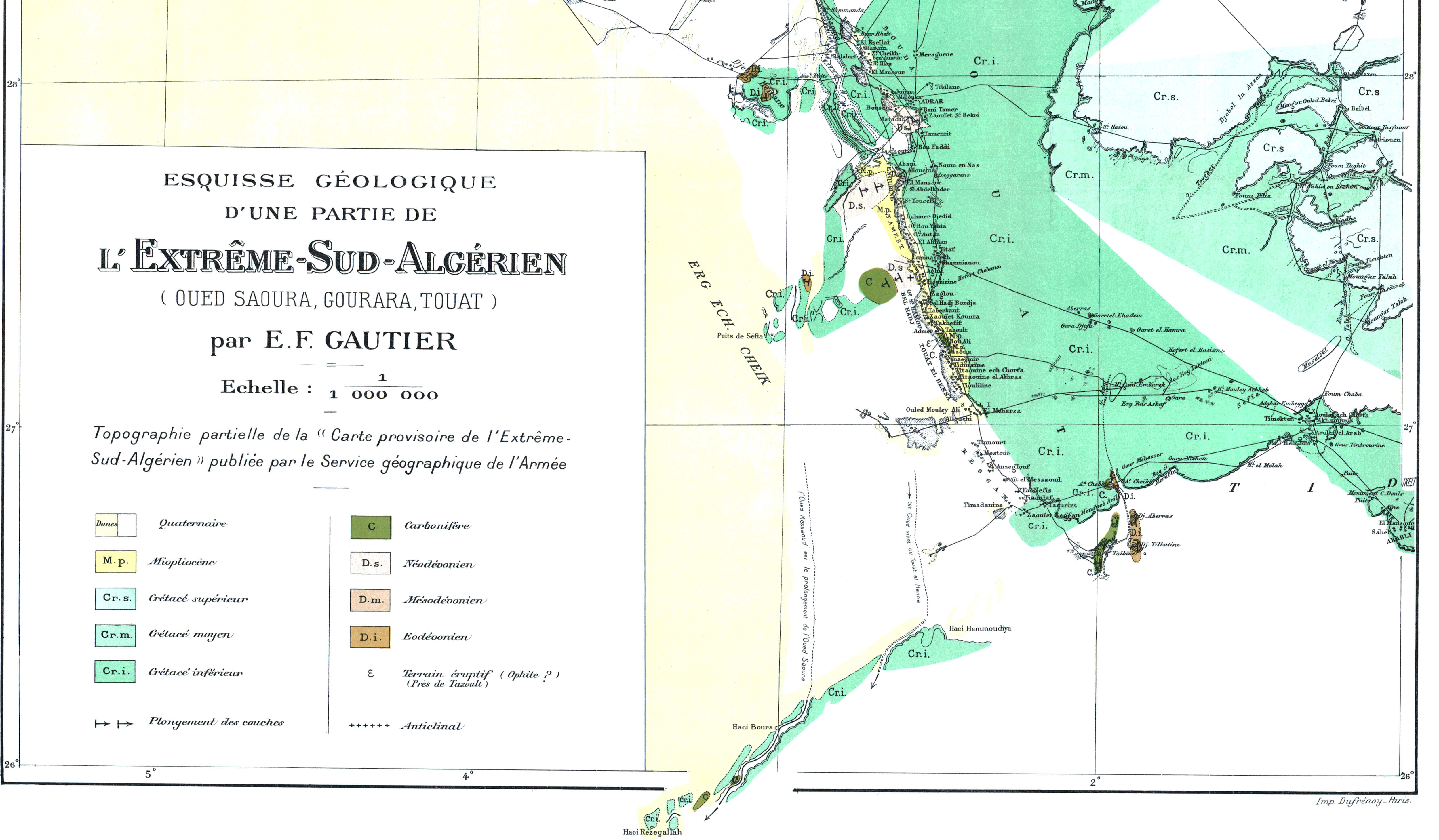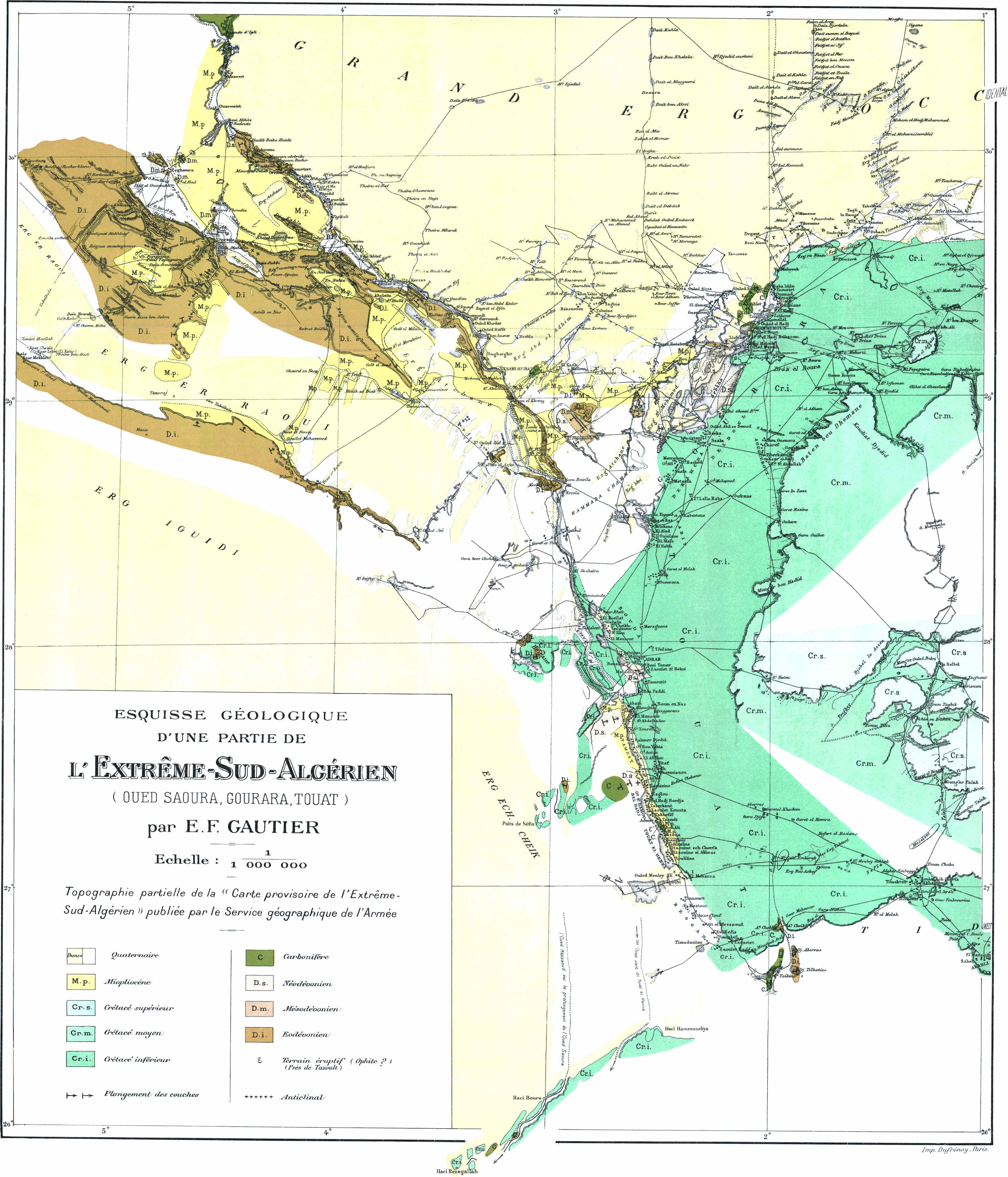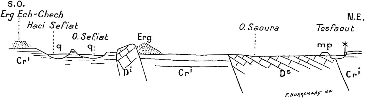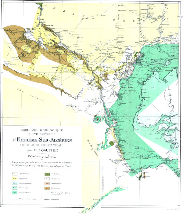 Dans un ouvrage où j’ai donné une place considérable à l’étude géologique et plus spécialement stratigraphique on pourra s’étonner que la paléontologie soit à peu près complètement absente. Pourtant un grand nombre de fossiles ont été recueillis. Ceux qui se rapportent à l’âge carboniférien, encore qu’intéressants par la nouveauté des gisements, ne nous apprennent rien de nouveau sur la faune dinantienne au Sahara. Les fossiles dévoniens en revanche sont apparemment intéressants, surtout ceux des étages supérieurs, puisque M. Haug, dans le laboratoire de qui ils ont été déposés, va leur consacrer une monographie.