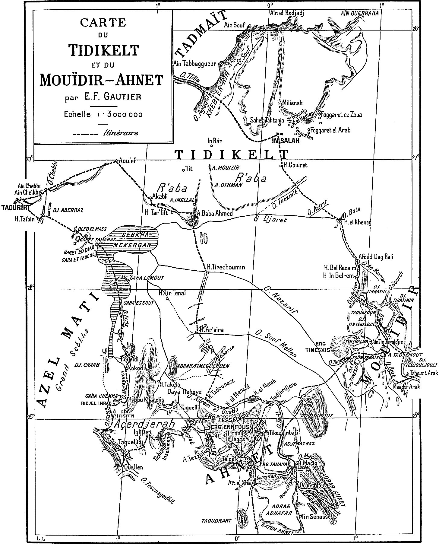 Expliquer un mot d’ailleurs, c’est chercher à comprendre la chose, à en dégager la genèse. Un chapitre d’onomastique saharienne c’est en quelque sorte une étude du climat désertique dans son retentissement sur les sols, les formes topographiques, l’hydrographie.