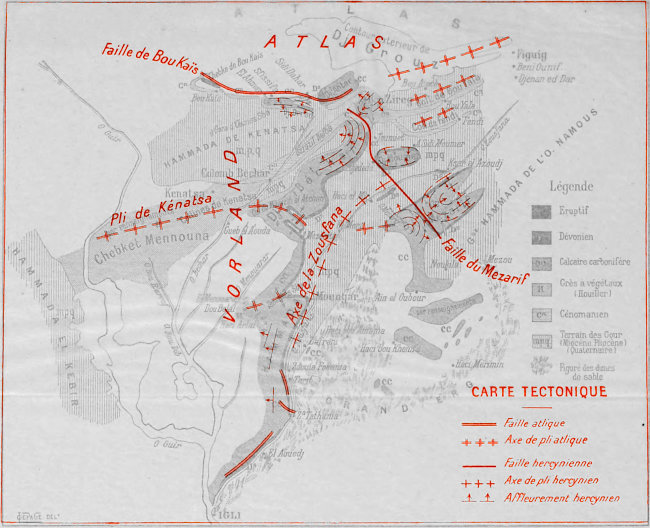 | Roches primaires carbonifériennes, 139. — Roches secondaires, 143. — Plis hercyniens, 144. — Plis atliques, 145. — L’ennoyage, 148. — Importance géographique du Vorland primaire, 150. — Gîtes minéraux du Grouz, 152. — Pluies et végétation, 154. — Régime des eaux, 155. — Nappe artésienne, 156. — Les oueds, 157. — Groupe d’oasis de Béchar, 159. — Tar’it, 161. — La vie sociale et économique, 166. — La route transsaharienne et Figuig, 170. — La question marocaine, 171. — La pacification, 174. | |