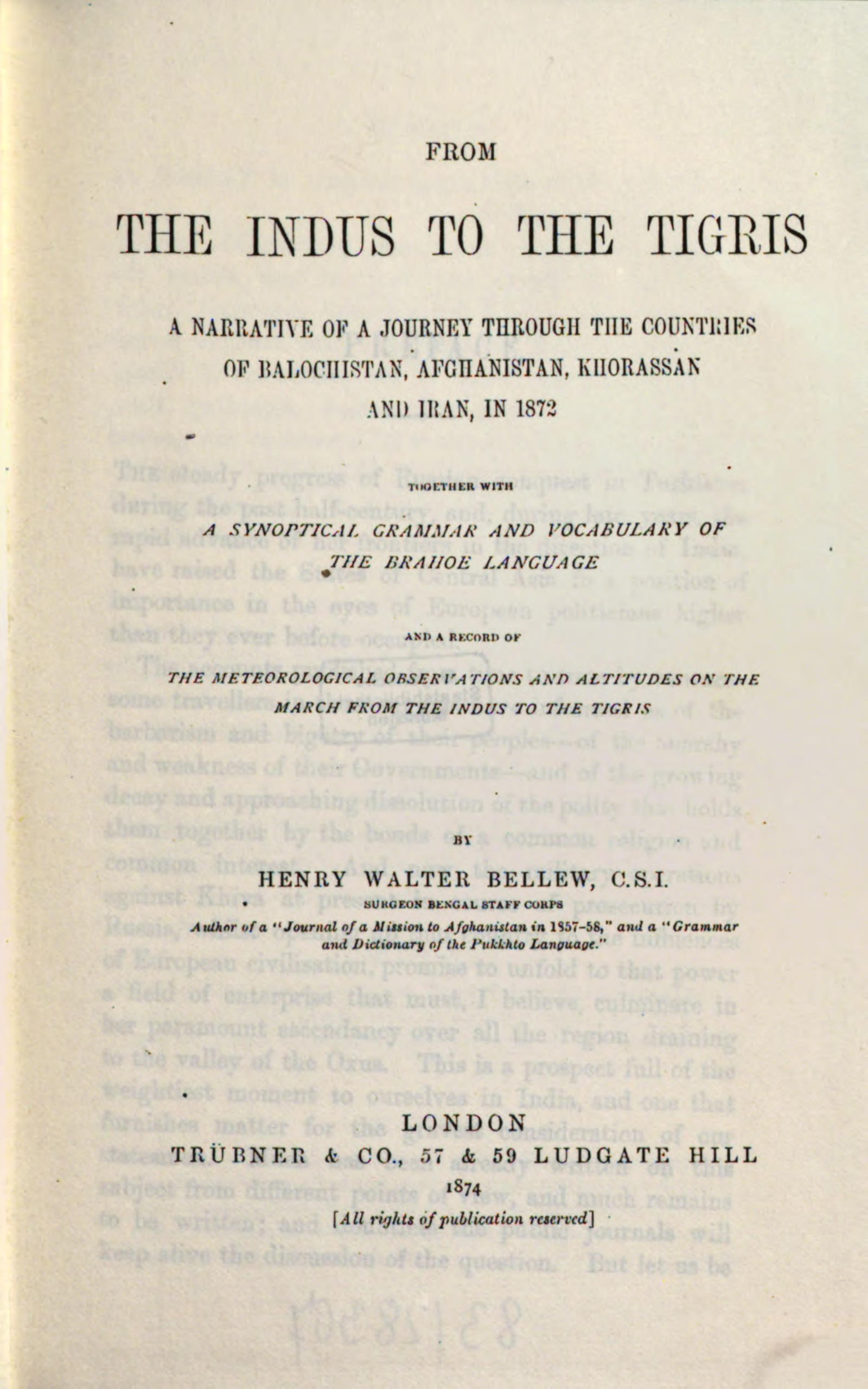 The materials from which the above Grammar and Vocabulary are compiled were collected during a rapid journey through the territories of the Khán of Calát—the Brahoe country—and tested, so far as opportunity offered, by reference to natives in different parts of the country, and by comparison with Eastwick’s “Epitome of the Grammars of the Brahuiky, Balochky, and Panjabi Languages.” It was my intention to have added some dialogues and phrases as a conclusion to the work. But to do so would extend the limits of this book to undue proportions, and delay its appearance indefinitely. I have therefore left this part of the work unfinished, and only offer the above synopsis in the hope that it may prove useful to the officers serving on the Sind Frontier; and if it should happily stimulate one amongst them to correct its errors, supply its deficiencies, and enlarge its scope, then the object of my labour will have been gained.