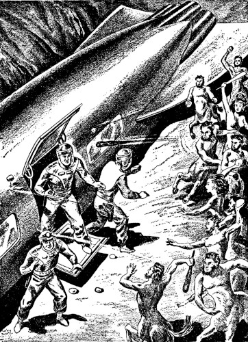 He never finished his denunciation of Biggs. For at that moment the oncoming Themisites hove within hurling distance—and started hurling! Only this time it was not, as it had been a short while before, flowers. This time their expressions of "everlasting peace and affection" were offered with—stones, arrows, and spears!