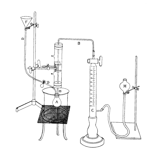 When an experiment was to be conducted, the azotometer C, was connected to the tube, B, and tied tightly, a piece of good rubber tubing being used for the connection. The reservoir of the azotometer, M, was then raised until the mercury had driven out all the air in C, and the stop-cock closed. Next the funnel F was filled with water, the pinch-cock closing D opened and the water allowed to flow down and drive out all the air in the tube. The latter was then clamped and thus kept full of water. The apparatus being now ready, the flask A, containing the substances in the desired quantity, was made fast to B and D by means of its stopper. The stop-cock of C opened. The flask A was heated in a water bath for any desired time, the oxygen being collected in C as fast as [Pg 8] it was given off.