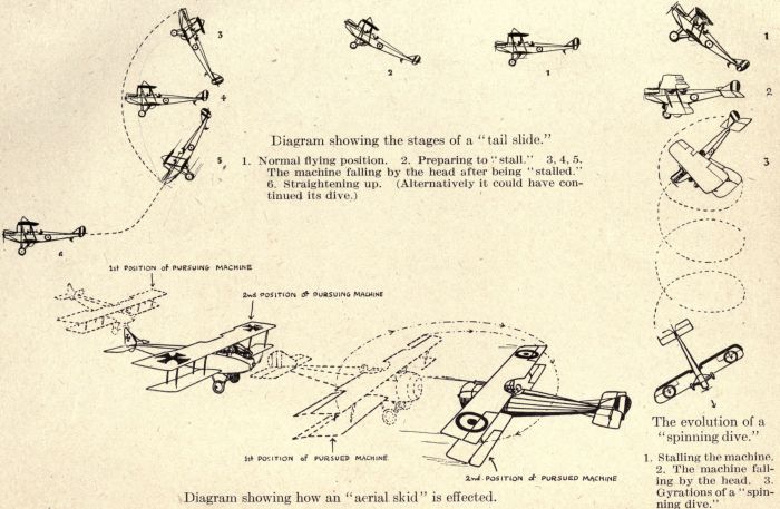 | NIGHT FLYING—FORMATION FLYING—STUNTING—IMMELMAN TURN—NOSE DIVING—TAIL SPINNING—BARREL—FALLING LEAF, ETC. | ||