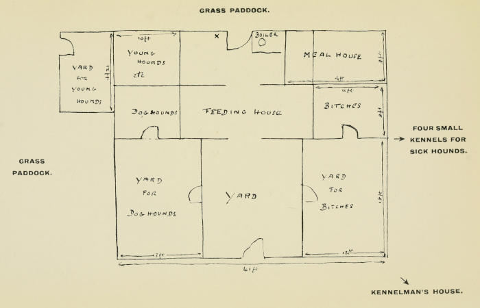 Now we will suppose that the hounds are kept in their kennels always throughout the summer; then the new Master can be with his hounds all the summer and good blood can be got in the pack by sending bitches to well-known beagle packs, and in time a very good strain could be got. All the puppies would be sent out to walk till they are twelve months old and fit to join the pack. I don’t think there would be any difficulty in finding either boys or farmers to walk the puppies, and a small challenge cup could be given, as in other packs, for the hound best walked. Thus a good entry could be made, and the old hounds drafted. Of course, to get a good and well-bred pack would take about[123] twelve years; but we all hope at some future time or other to see the E.C.H. entered in the stud book, and to see the first prize at Peterborough won by a hound belonging to the E.C.H. There is no reason why all this should not take place, provided a good kennelman is kept, and the Master devotes heart and soul to his hounds, and is careful to get good fresh blood in the pack.