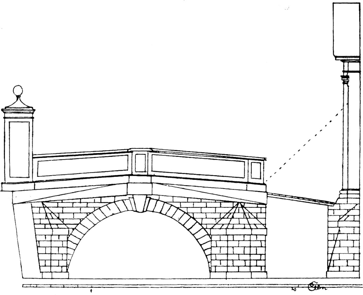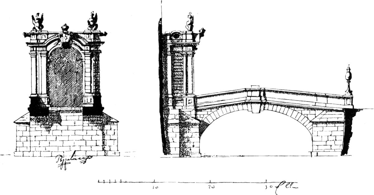 Die in Abbildung 1 wiedergegebene Zeichnung ist also nach Pöppelmanns Angaben (Skizzen) im Oberlandbauamt gemacht worden, und zwar von seinen Baubeamten (Kondukteuren), denen er auch die zwölf Thaler zukommen ließ.[179] – Leider ist die Zeichnung vom Maurermeister nicht mehr vorhanden, so daß kein Vergleich möglich ist. Jedenfalls war auf dieser ein Pfeiler, ähnlich wie in Abbildung 3 vorgesehen. Pöppelmann überspannt den Graben mit einer einzigen Bogenöffnung in gefälliger Form und läßt, wie im Schnitt zu sehen ist, im Brückenbogen eine Öffnung für die Zugbrücke. Diese gefährliche Stelle sollen nachts die beiden Brückenlaternen beleuchten. Das Tor, dessen äußere Pilaster übereck gestellt sind, ist mit kriegerischem Schmuck versehen, mit Fahnen, Helmen, Panzern, Schilden, Kanonenrohren. Der Schlußstein mit Krone erinnert an die allerdings bei weitem reichere Ausführung am westlichen Zwingerpavillon. Wie vorteilhaft würde ein solches Tor an der glatten Mauer des Festungsrondells gestanden haben! Aber es kam gar nicht zur Ausführung, weil die Steinmetzarbeiten zu teuer erschienen.