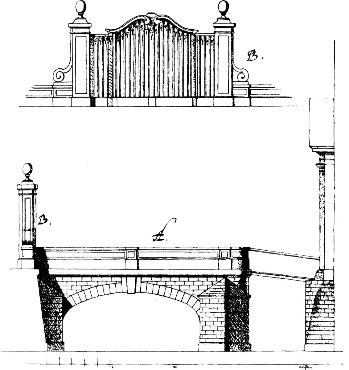Der Umbau des Frauentors wurde 1724 beschlossen. Der Rat hat sich zunächst an den Obrist-Lieutenant und Baudirektor Johann Christoph Naumann in Dresden gewendet. Er war Baudirektor der Akzis-Behörde. Weil die Steuereinnehmer- und Torschreiberwohnung verändert werden sollte, wandte man sich zunächst an ihn. Er übersandte seine »Gedanken« in zwei Zeichnungen: Ansicht des Tores (Abb. 2) und der Brücke (ähnlich wie Abb. 3). Am 27. Mai 1726 wurde an Pöppelmann geschrieben und die Zeichnung, die in Abbildung 3 zum Teil wiedergegeben ist, mitgeschickt. Er antwortete am 7. Juni: »... Ew. Hoch Edle und Hochw. übersende beygehend ich den mir zu geschickten Riß des aufzubauenden Stadt Thores und Brücke nebst einer anderweitigen copey deßselben, (Abb. 4), in welcher ich meine unmaßgebliche Gedanken und Gutachten zugleich mit zu erkennen geben wollen. Gleichwie nun nachdem neuen und von mir entworffenen Riße das Thor sowohl als die Brücke ein beßeres Ansehen gewinnen dürffte also halte auch dafür, daß es beßer gethan seyn möchte, wenn nach dem Adjecto sub A die Brücke gerade fort in einer Linie gezogen und nicht abhängig gemacht werden solte, maaßen solches der Brücke selbsten ein gutes Ansehen geben dürffte. Wegen des Waßer Abfalls[181] aber kan die Brücke von inwendig darnach gepflastert und das Regen Waßer durch Ausgüße in den Fluß gewießen werden, wodurch den endlich der faciata keine Unförmlichkeit zugezogen würde. Wenn auch ferner an der Brücke ein Gatter Thor, wie ich solches ohngefehr gezeignet (B), gefertigt werden wolte, dürffte solches gleichmäßig eine formität dem Thore selbsten machen und das Anlaufen derer Leuthe an die Aufzieh Brücke bey Nachtzeiten verhindern, mithin vielleicht besorglichen Schaden verhütten ...«
