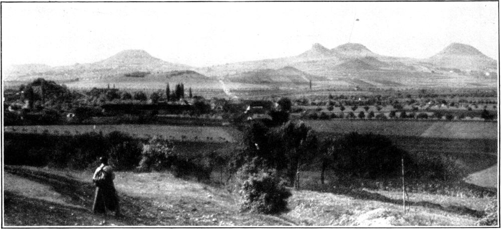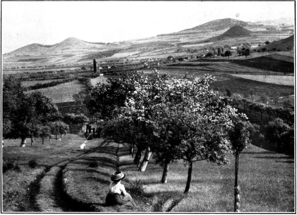 Abbildungen 3 und 4: Bei Liebshausen. Eine reichgesegnete Landschaft am südlichen Rande des böhmischen Mittelgebirges: weite ebene und sanftansteigende Ackerflächen, fruchtbar, voll Weizen und Zuckerrüben; jeder kleine Weg, jede Straße mit Obstbäumen bepflanzt, selbst die Feldflächen in geradlinigen Reihen mit ihren runden Kuppen durchzogen. Wohin das Auge schaut: Fruchtbarkeit des Bodens und Fleiß der Bewohner. Aber auch eine von der Natur allein ins Großzügige, ins Gewaltige gesteigerte Landschaft: die weite wellige Ebene wird umrahmt von seltsam geformten Bergen, unter denen nur drei der bekanntesten genannt sein mögen: Hoblik, Ranneyer Berg und Milleyer Berg. Da sie vom Fuße bis oben auf den langgestreckten Gipfel nur mit einer immer kurz bleibenden, von den Schafen fortwährend abgefressener Grastrift, beinahe ohne jede Strauch- und Baumgestalt, bedeckt sind, heben sich ihre scharf umrissenen Linien und Flächen fast trotzig drohend und gerade darum den Wanderer anziehend vom weiten Horizont ab. Und in welch farbigem Duft stehen sie manchmal da, wenn Sonne und Wolken die Luft malen!