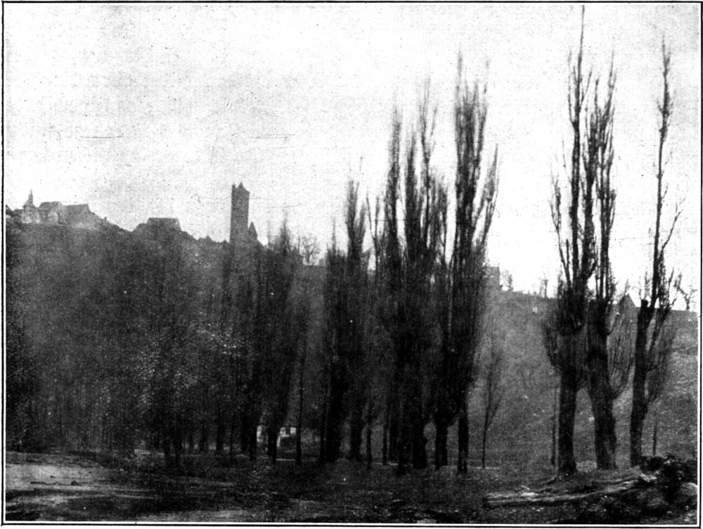 Abbildung 7: Im Taubergrund vor Rothenburg. Unten an der Tauber schon leise Abenddämmerung. Oben auf der steil ansteigenden Berglehne entlang noch im Lichte die Stadt, wie ein heilig Jerusalem im deutschen Land, wie eine vieltürmige märchenhafte Burg. Es zieht den Blick immer wieder hinauf zu ihr. Und es kann keinen anderen, keinen besseren Baum geben, der das Auge hinaufleitet, an dem die Gedanken hinaufsteigen, der die Sicht in so vielen Bildern uns genießen läßt. Und dazu der Gegensatz! Unten die Bäume alt, müde, vom Zahn der Zeit zermürbt – droben die Stadt,[191] die, noch im Schmuck der Mauern und der Türme vom alten Deutschen Reich erzählend, nicht vergeht.