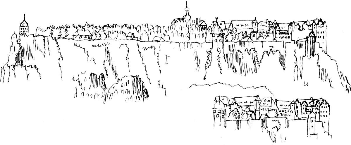 Schon grüßte uns das schwarze Kreuz auf seiner einsamen Höhe, und jetzt, jetzt standen wir oben auf dem Kamme, und der Blick schweifte sehnsüchtig und suchend hinab in die Tiefe. Noch hüllte sich das Mittelgebirge in leichten Nebel, aber links und rechts von uns und unmittelbar zu unseren Füßen glänzte das Land im goldenen Sonnenschein. Gleich rechts uns zur Seite stieg wie ein mächtiger Eckpfeiler der Stürmer empor, am Hange halblinks vor uns lagen hingebettet und sich an den Boden anschmiegend die schindelbedeckten Häuschen der alten Bergstadt Niklasberg. Wir folgten ihren Reihen, bis sie sich im Laubgewirr des Hüttengrundes verloren, den die Eisenbahn Eichwald–Klostergrab–Brüx auf hoher, kühner Brücke überquert. Und drüben im Südosten sahen wir, vom Schloßberge hoch überragt, die Badestadt Teplitz, deren heilkräftige Quellen schon manchen von langem, schmerzensreichen Siechtum erlöst haben.