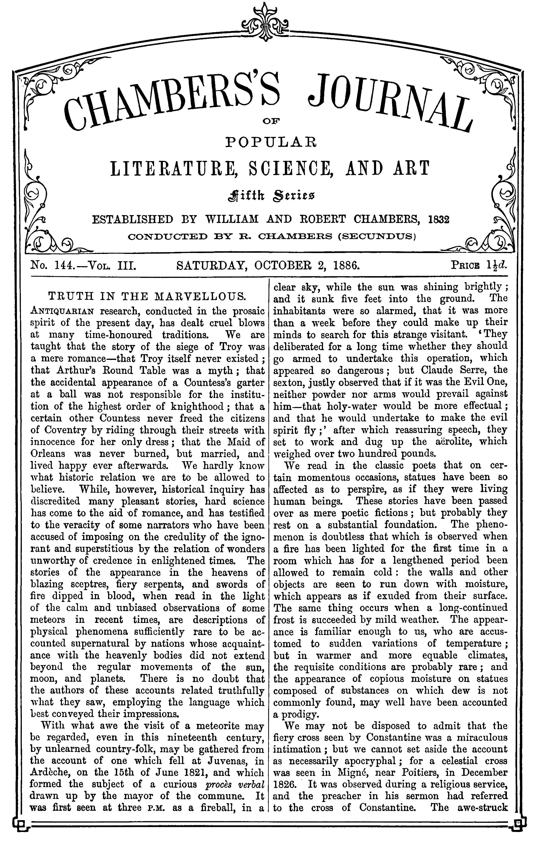 Besides those mentioned above, many other strange stories might be instanced which, at the time, were accepted as true accounts of supernatural appearances; and afterwards, when the general belief in spiritual manifestations declined, were denounced as false, because contrary to nature, but have since been recognised as consistent with natural laws. By taking into account the surrounding circumstances, the state of knowledge at the time, the customary modes of expression, &c., we may, from many stories at first sight incredible, arrive at a substratum of truth which may form a valuable addition to the sum of human knowledge. Imbued with a sense of their own superior wisdom, learned men, and others who have thought themselves learned, have sometimes rashly pronounced as impossible, and therefore untrue, phenomena which have since been accepted as facts. In Arago’s Popular Astronomy is an account of a meteorite which struck the earth at Lucé, in the year 1769. It was perceived in the sky by several persons, who watched its progress until it reached the surface of the earth, when it was at once picked up and preserved; but the Academy of Sciences pronounced it impossible for a solid body to have fallen from the heavens. On the 24th of July 1790, a quantity of these stones fell at St Juliac—in the fields, on the roofs of the houses, and in the streets of the village. The fall was preceded by what is described as the passing of a great fire, after which was heard in the air a very loud and extraordinary noise. The facts were certified by the{628} municipality of the place and by some hundreds of the inhabitants; but the affair was treated in the public journals as a ridiculous tale, calculated to excite the compassion not merely of savants, but of all reasonable persons.
