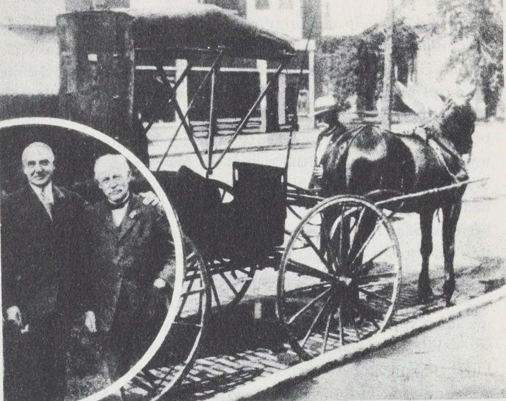 Before my doctor-father acquired the small red motor runabout which served to carry him about on his professional calls, he was a good customer at these livery stables, and we children often accompanied him. Often he gave the reins into my small hands and I experienced the thrill of a real charioteer as I called “Giddap!” to the horse and whisked imaginary flies off his back with the reins, even as I had seen my father do.