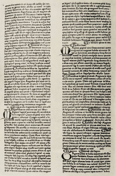 [13] In his “De Mineralibus” (Lyons ed. 1651, Treat. III. lib. ii. cap. 6, p. 243), Albertus says: “One angle ... is to the zohron (north) ... but another angle of the magnet opposite to it attracts to the aphron (south).” Cardan (“De Subtilitate,” Lugduni, 1663); Salmanazar (Book II. “of the Egyptian Hermitus, 19 stars, and 15 stones, and 15 herbs, and 15 figures”: “on one side the magnet attracts iron, on the other side repels it); Pietro d’ Abano (“Conciliator Differentiarum,” Mantuæ, 1472, Diff. 51, p. 104, or the 1520 Venice edition, p. 73: “know that a magnet is discovered which attracts iron on one side and repels it on the other”).