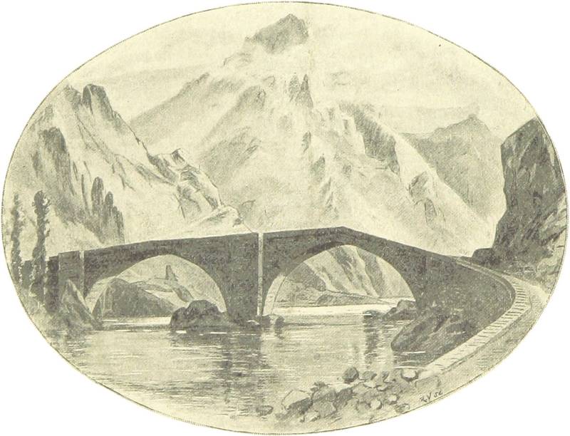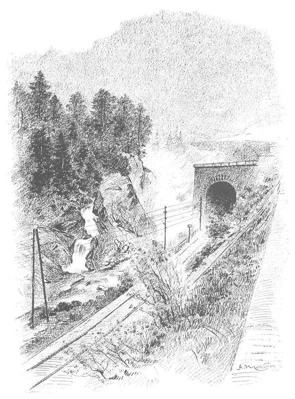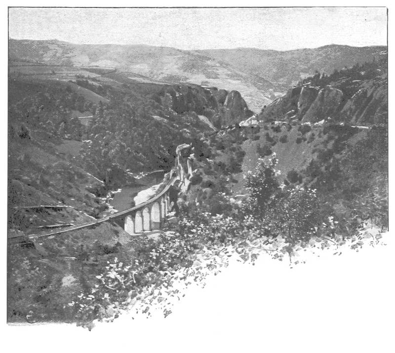 De Brioude vers Langogne, «entre les monts du Velay, nus et calcinés par cent cinquante volcans éteints, épars ou groupés, et les monts de la Margeride, drapés de forêts épaisses, l’Allier roule un torrent où se reflètent d’un côté les granits, de l’autre les massifs de sapins, de hêtres et de chênes». Le chemin de fer côtoie la rivière, au prix des travaux d’art les plus hardis, par Saint-Georges-d’Aurac, prés de Chavaniac où naquit La Fayette, par Langeac, à travers ces gorges de l’Allier, où, tout le long s’émerveille l’œil, à Chanteuges, à Prades, à la Tour de Rochegude, à Monistrol! Quel drame d’eau, de rocs, de ciel, coupé 346 en scènes palpitantes, comme par un baisser de rideau, à chacun des tunnels—une centaine de tunnels, une cinquantaine de viaducs, pour un parcours de cent et quelques kilomètres!