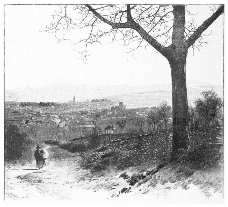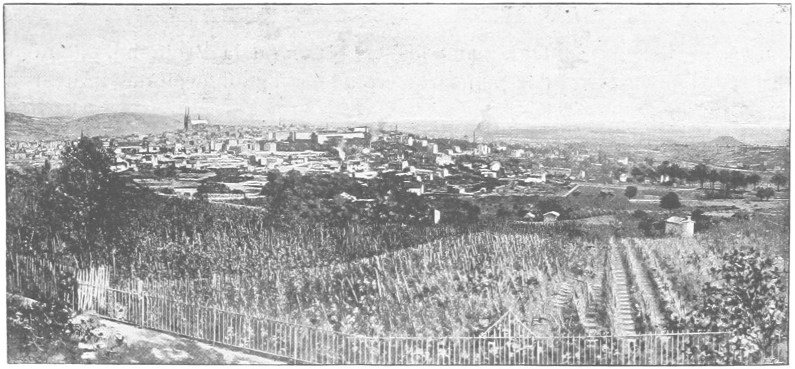 Clermont-Ferrand.—L’idée que l’on s’en fait; les volcans, Bituitus et ses chiens, César, Vercingétorix, saint Austremoine, Crocus, Honorius, Evarix, Pépin le Bref, les Normands, Urbain II et la première Croisade, les seigneurs et les évêques, les Anglais, les Huguenots, les «Grands-Jours», etc.—Visiteurs illustres; ce que pensent Sidoine Apollinaire, Fléchier, Legrand d’Aussy, Chateaubriand.—Le Puy-de-Dôme à tous bouts de rues; la Cathédrale et Notre-Dame-du-Port; l’évêque saint Gal et les hirondelles inciviles; le «roman» auvergnat; les logeurs du bon Dieu.—La maison de Blaise Pascal, la fontaine Saint-Allyre et les autres, les squares, les places, les rues, la statue de Desaix.—Pourquoi Clermont manque d’alignement; malice de Riom.—Splendeur et décadence de Montferrand; une garde nationale féminine.—La population; fécondité proverbiale des Clermontoises; les nombreuses familles; encore Fléchier et Chateaubriand.