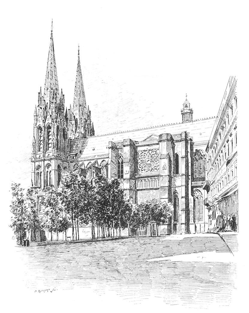 Certes, l’effet n’est pas banal de la façade blanche et rouge, avec son portail aux colonnes de porphyre, au bout du long escalier qui, partant de la pente dure de la rue des Tables, bifurque sur les côtés, mais donne toujours l’illusion qu’il s’enfonce dans l’église, comme jadis où il pénétrait jusqu’au centre: ce qui faisait dire «que l’on entrait à Notre-Dame par le nombril, et que l’on en sortait par les oreilles».