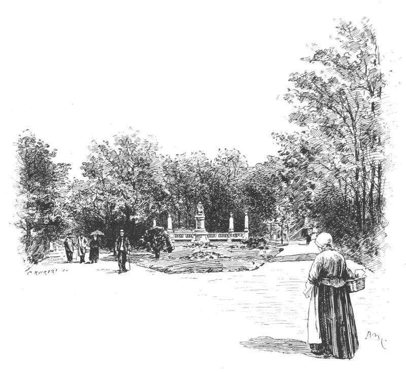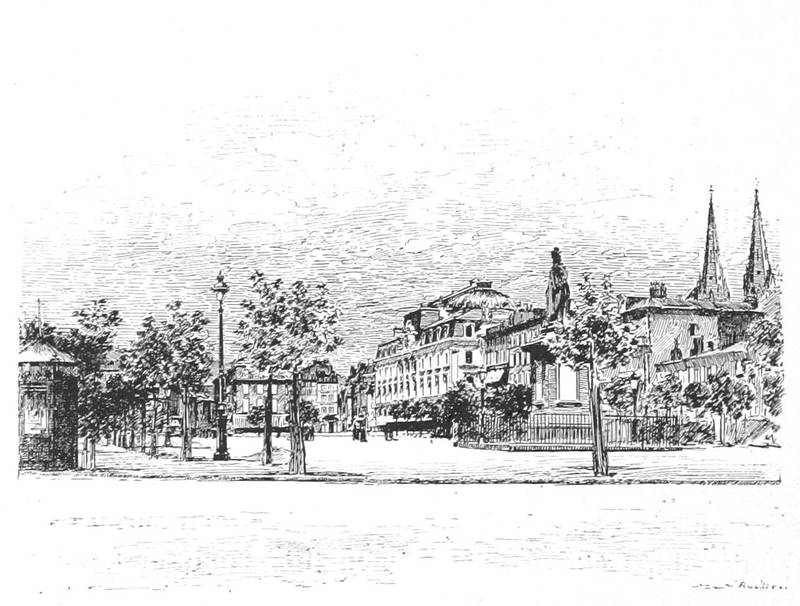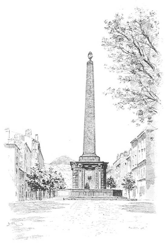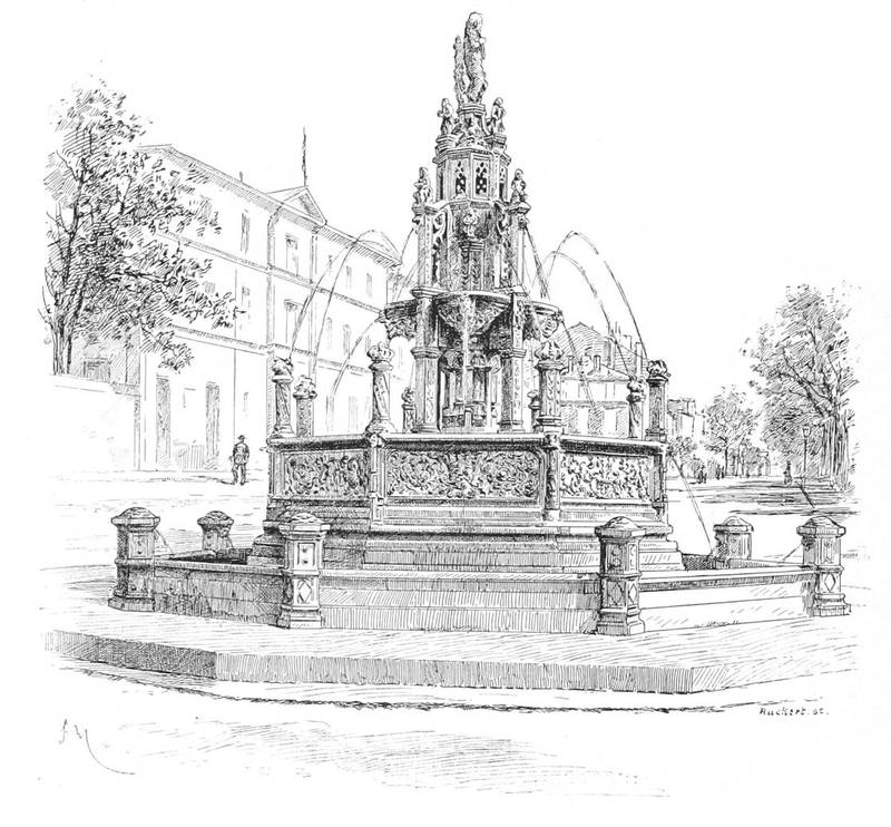 Dans les rues, à travers le va-et-vient de la vie locale, au hasard de la flânerie, nous nous arrêtons à des maisons anciennes, à la maison de Pascal, à des façades ornées de modillons, à des noms de rues, rue des Chaussetiers, rue des Gras, à des marchés, au jardin Lecocq, à des squares, le square Pascal, à des statues, la statue de Pascal, la statue de Desaix, le Sultan juste de la campagne d’Égypte, le vrai vainqueur de Marengo qui, consultant sa montre à l’heure où le gros de l’armée fléchissait, se serait écrié: «la bataille est perdue, mais nous avons le temps d’en gagner une autre.» Ce qu’il fit, avec sa réserve—mais en y laissant la vie. Nous expédions les hôpitaux, casernes, théâtres, évêché, lycée, le lycée Pascal, palais des Facultés, la plupart de pierre de Volvic; aussi l’ensemble est-il assez chagrin, comme s’il tombait de la cendre, perpétuellement! Et pour cette raison, tant de fontaines d’eau admirable, qui devraient fournir l’agrément des places, des jardins, des avenues, si l’on avait employé granits ou porphyres, n’y mettent qu’une monotone 11 ornementation; magnifiques eaux si limpides et fraîches, dont les jets de cristal, dans toute la joie de la lumière, ne s’élancent, retombent, s’éparpillent que comme des larmes brillantes, mais tristes, dans ces vasques de deuil, couleur de crêpe!