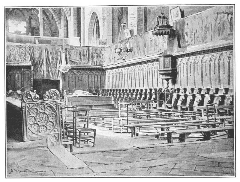 Ce n’est que mutilations et décrépitudes, pourriture, vétusté; les cent cinquante stalles encloses dans le chœur des religieux, avec leurs sculptures vantées, ne sont plus là que comme dans un garde-meuble, un hôtel des ventes. A notre passage, les tapisseries fameuses avaient été détachées, pendant des réparations aux toitures; elles gisaient dans des sacristies où nous en déroulâmes quelques-unes—merveilleuses—comme des carpettes sur le sol... D’une Danse macabre, d’une fresque à cinquante ou soixante personnages, qui décorait le mur d’un bas-côté, il n’y a plus que quelques traces informes, qui s’effritent, desséchées, ou se détrempent, en grumeaux...; on a hâte de s’éloigner de tout cela, qui n’a point la grandeur tragique, la noblesse, la majesté des ruines ni de la mort, mais c’est l’horreur de la détresse d’un lieu après une épidémie, cela a une odeur de fièvre, de choléra, de peste, c’est comme une lèpre qui mange et dégrade les choses...