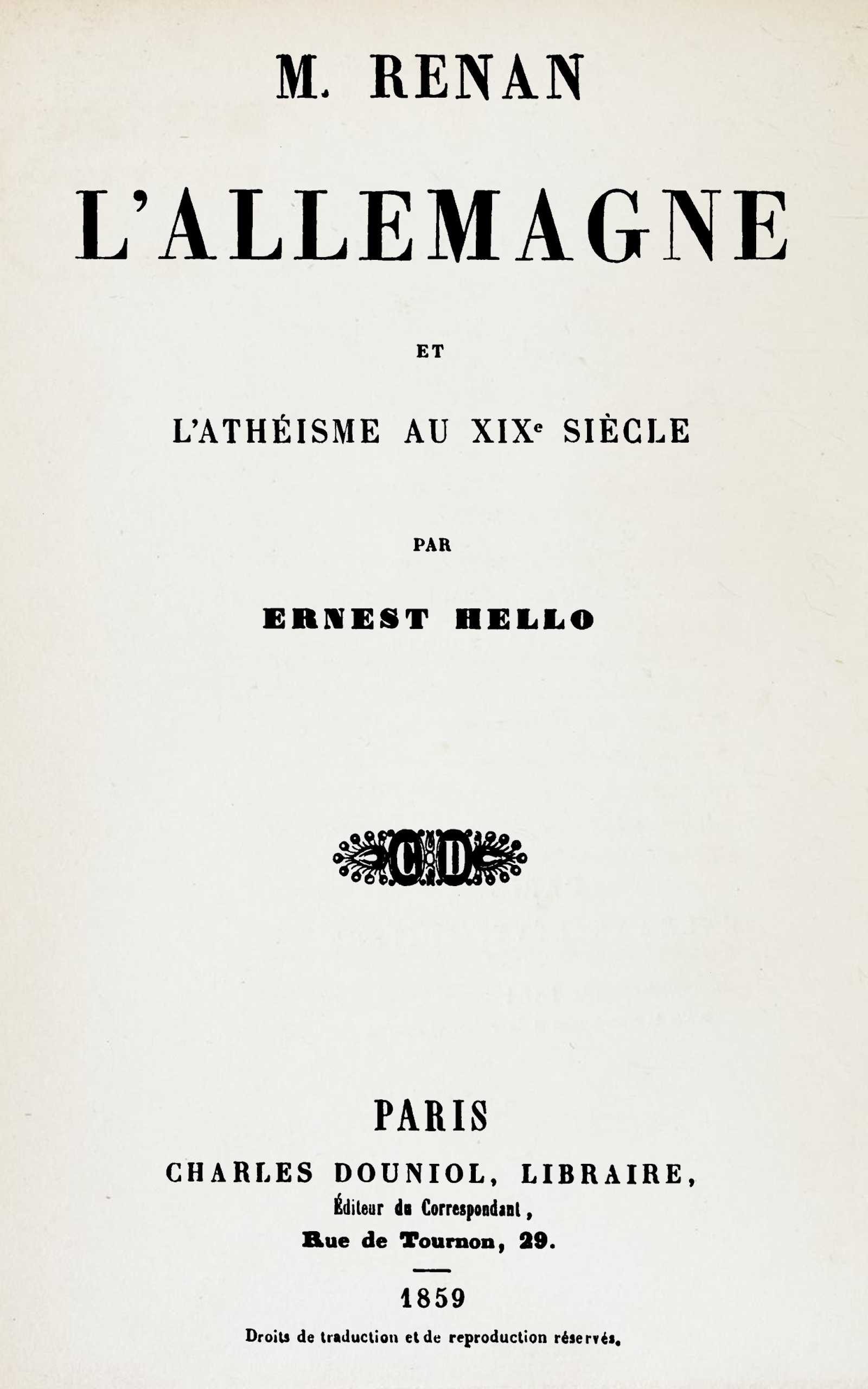 Nous allons étudier l’athéisme français dans le plus illustre de ses représentants actuels, M. Renan. Nous reconnaîtrons son magnifique talent ; mais nous l’admirerons sans nous laisser éblouir par lui. Nous nous tiendrons en garde contre le charme de cette parole humaine qui s’est tournée contre la parole éternelle, au lieu de la servir. Nous tendrons à ce noble égaré une main fraternelle ; nous lui offrirons dans nos rangs une place digne de lui. C’est donc pour lui, non contre lui que nous allons écrire ; mais nous prouverons à lui-même et à tous qu’il a lancé sur le monde ces quatre négations.