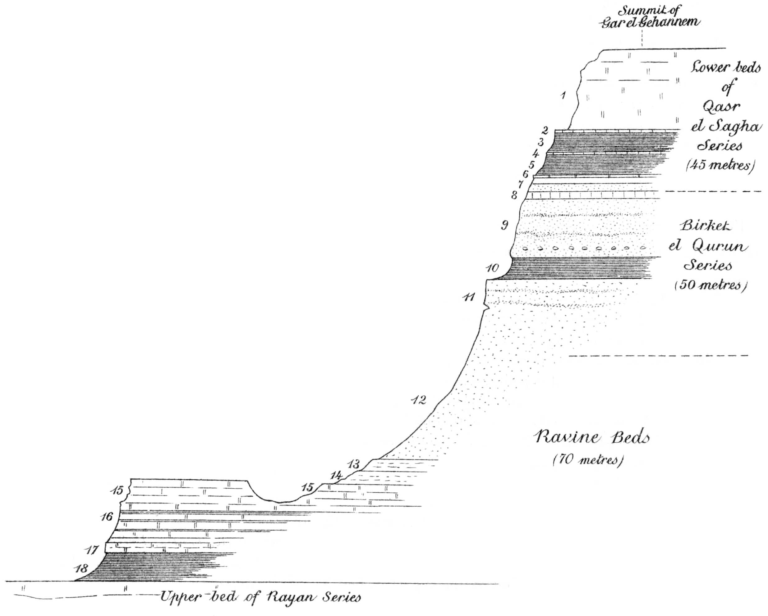 | B.—Ravine Beds.—In ravines of El Bats and El Wadi. Relation to underlying series seen at Gar el Gehannem. Section at Gar el Gehannem. Fauna of strata. In ravines unconformably overlain by Pleistocene, etc. Form plain bordering cultivation on east side. Extension into Nile Valley. Occurrence at Sersena and Tamia. Forming base of Geziret el Qorn and lower part of northern escarpment of Birket el Qurûn. West end of lake. Hard siliceous bands give rise to horns or promontories of lake. Ravine Beds in the Medinet el Fayûm boring. Thickness | 37 |