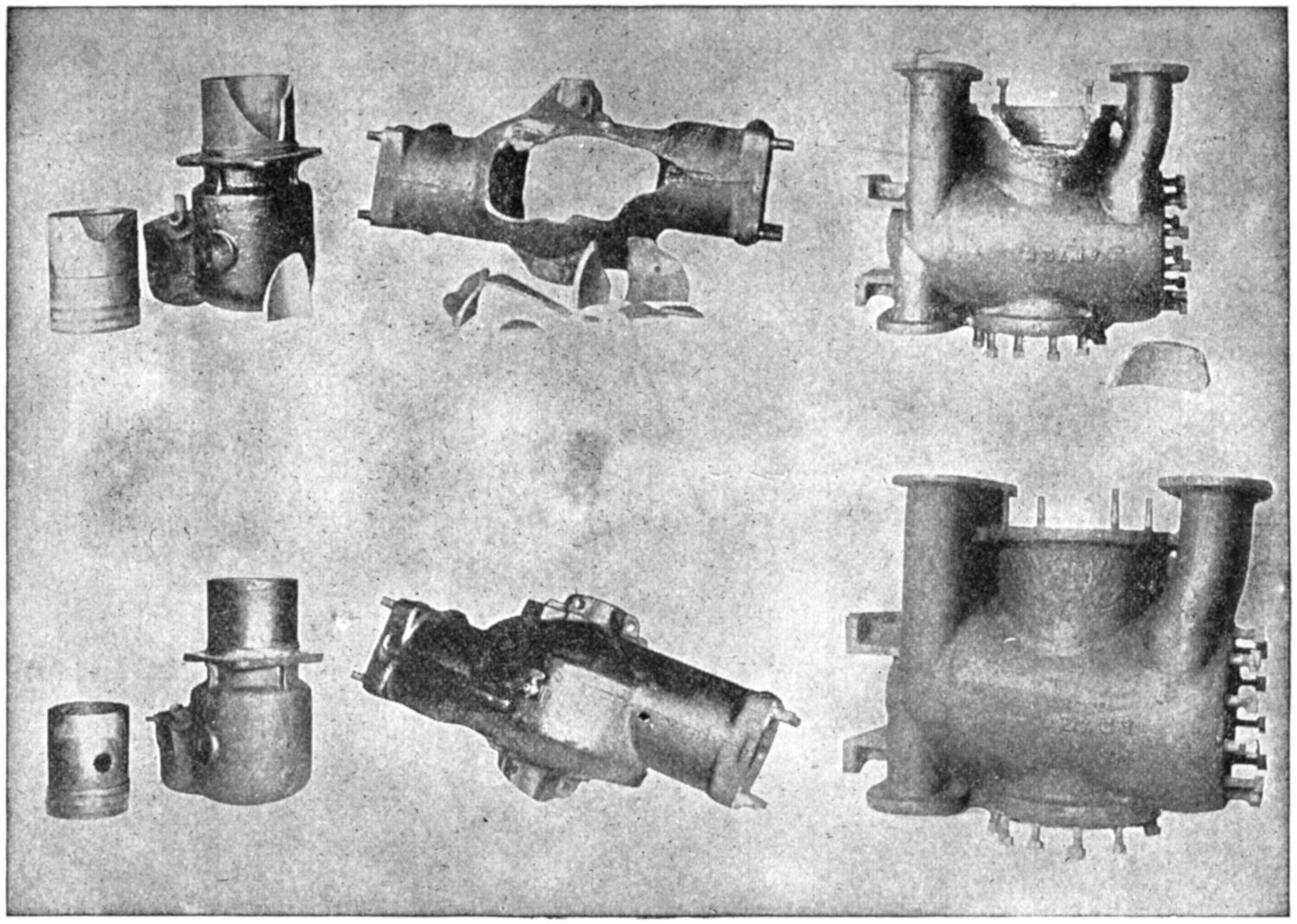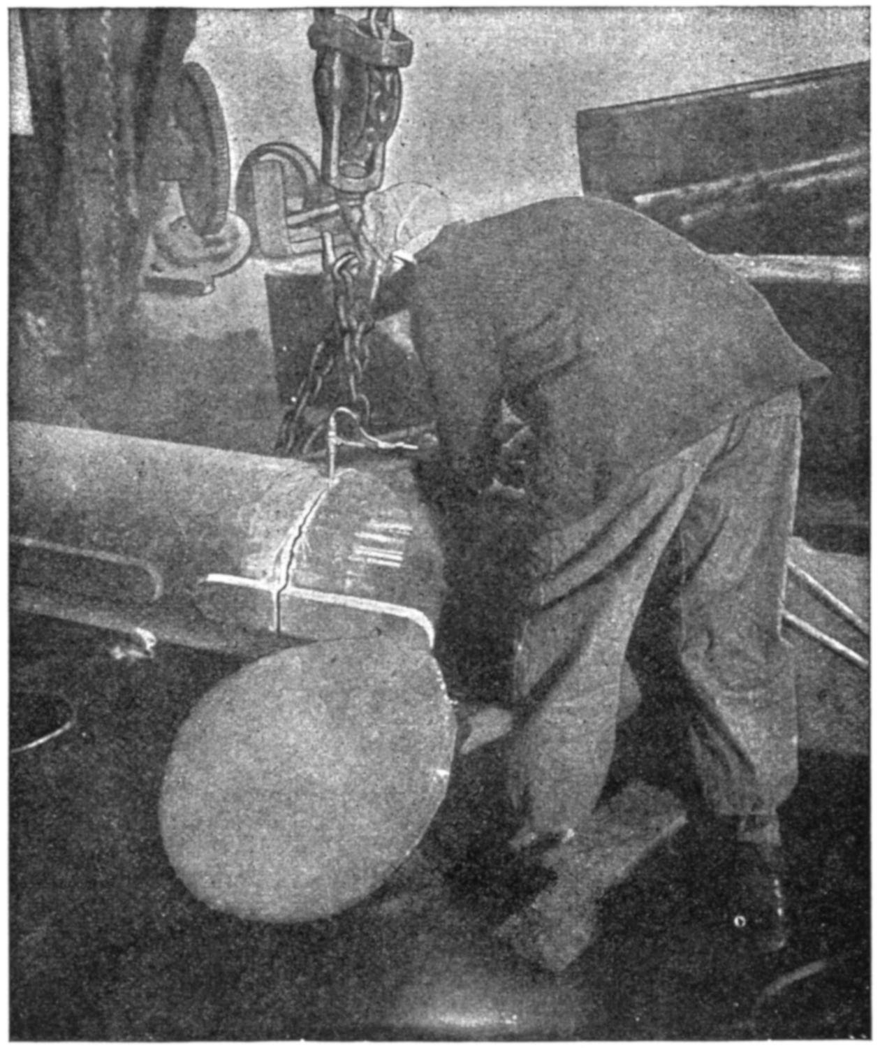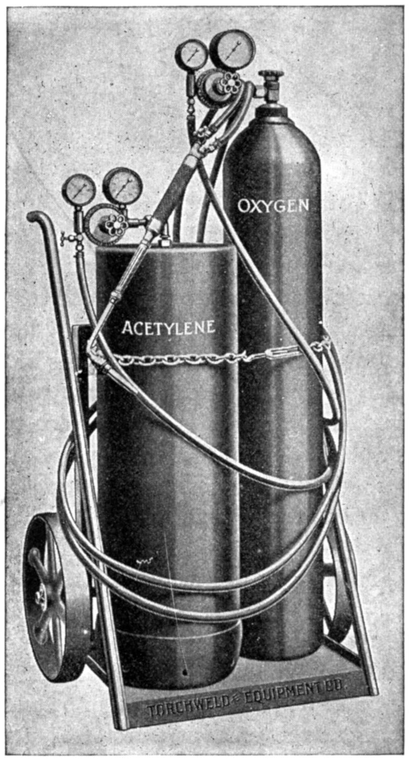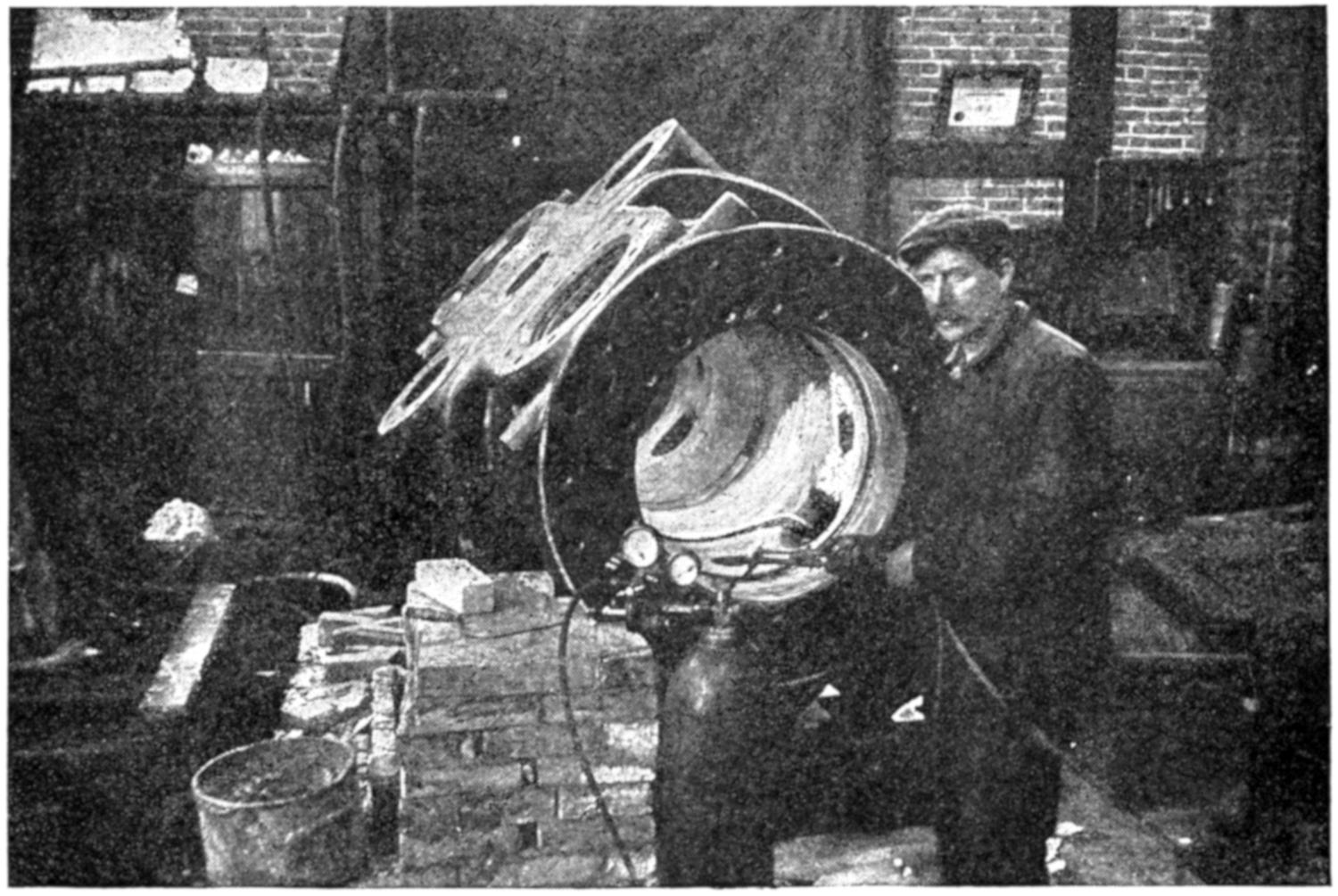 (4) As a repairing agent, the welding torch has no rival. Whether it is a casting of iron, steel, brass, or aluminum that has broken; a boiler or tank that has worn away in spots, or an error on the part of engineer, foundryman or machinist, the part can generally be reclaimed and made stronger than originally. To-day practically no manufacturing concern that is dependent upon metallic machinery could think of being deprived of its oxy-acetylene apparatus, once having learned its worth. In the not far distant past, were a gear or some casting to break, it probably meant closing[4] down the entire plant until a new part could be obtained, which, whether the source of supply were near or at a long distance, would mean costly delay. With oxy-acetylene equipment and an efficient operator on hand, almost every emergency is provided for.