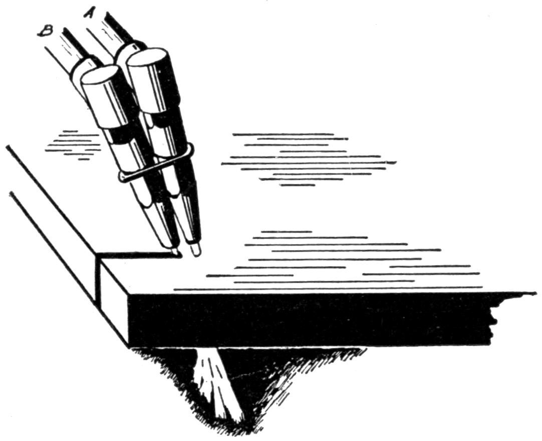 (2) It is singular indeed that a school manual, devoted exclusively to the instruction of the beginner, which will serve as an aid to the instructor as well as to the student, has not yet been put forth. It cannot be said that there is not a demand for such. Recently there seems to have been a mushroom growth of welding classes. The majority of the vocational schools, colleges, night schools, and automobile schools have all entered the instruction in oxy-acetylene welding on their rolls and each is attempting to instruct in an entirely different manner from the other.[vi] There can be no question as to the expediency of affording the educational institutions a systematic as well as a standardized method of instructing. But the books and articles of the nature mentioned are not suited to this purpose, and were not designed for it. A school-book is wanted; something to be used in the classroom, to be employed as a reference in the shop practice, to be studied for what it contains, and to indicate further lines of research, where such are required.