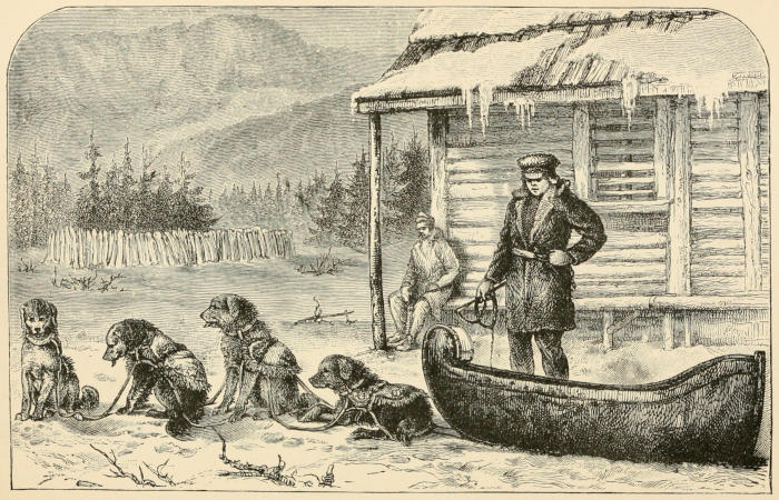 ‘I am not, however, writing a sermon. I was about to speak of my last winter journey to Albany. I wished to go there, because there was very little hope of my going next summer. At seven o’clock on the morning of December 21, I was sitting in my sledge, and ten beautiful dogs in excellent condition were being harnessed thereto, each having its own single trace, by which it was attached to the sledge. The archdeacon occupied a second sledge. When all were harnessed, there was a great howling, and jumping, and tugging, for the dogs were anxious to be off, but the sledge was too firmly moored for their united strength until all was ready; then the binding rope was cast off, howling ceased in a moment, each dog hauled with all his might, and we were away at the rate of ten miles an hour. The fine tails of the dogs were curled up over their backs, they were overjoyed to be once more on the road. The great pace was not long kept up, but settled into between five and six miles an hour, and so it continued throughout the day. To the music of our dog-bells we rushed down the river, soon losing sight of Moose, on past Middleborough Island, through Hay Creek, and then over a rough uncomfortable sort of plain at North Bluff, where stands the great beacon erected to attract[204] the attention of our annual ship, and to tell her that she is nearing the place of her destination.