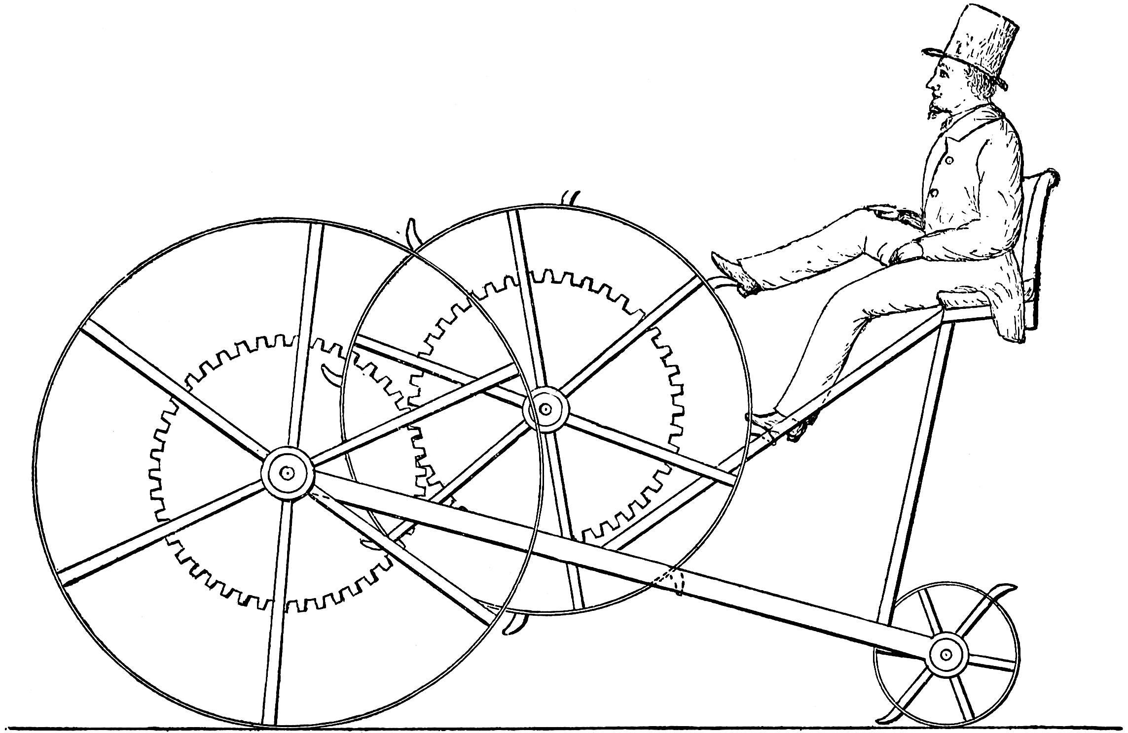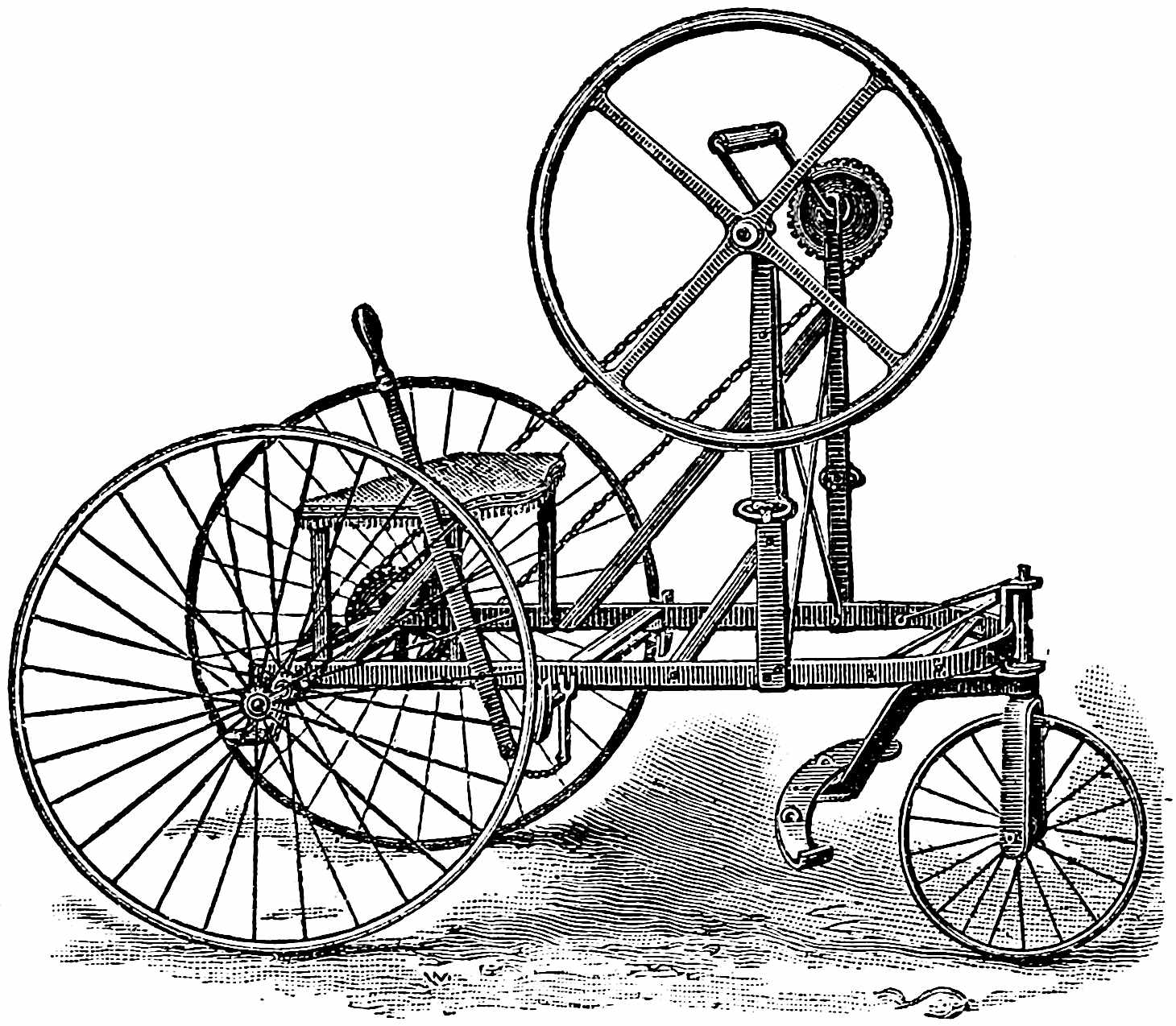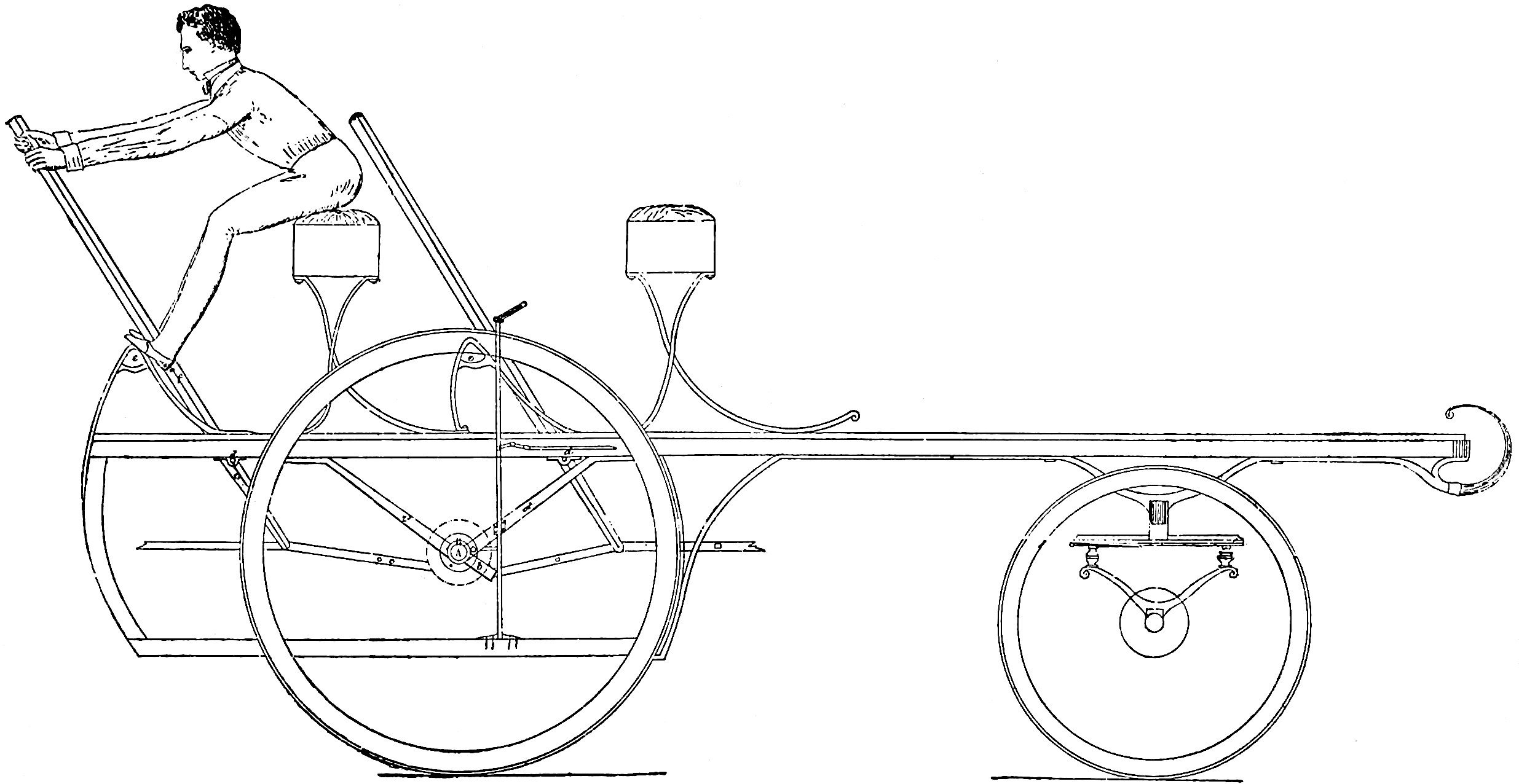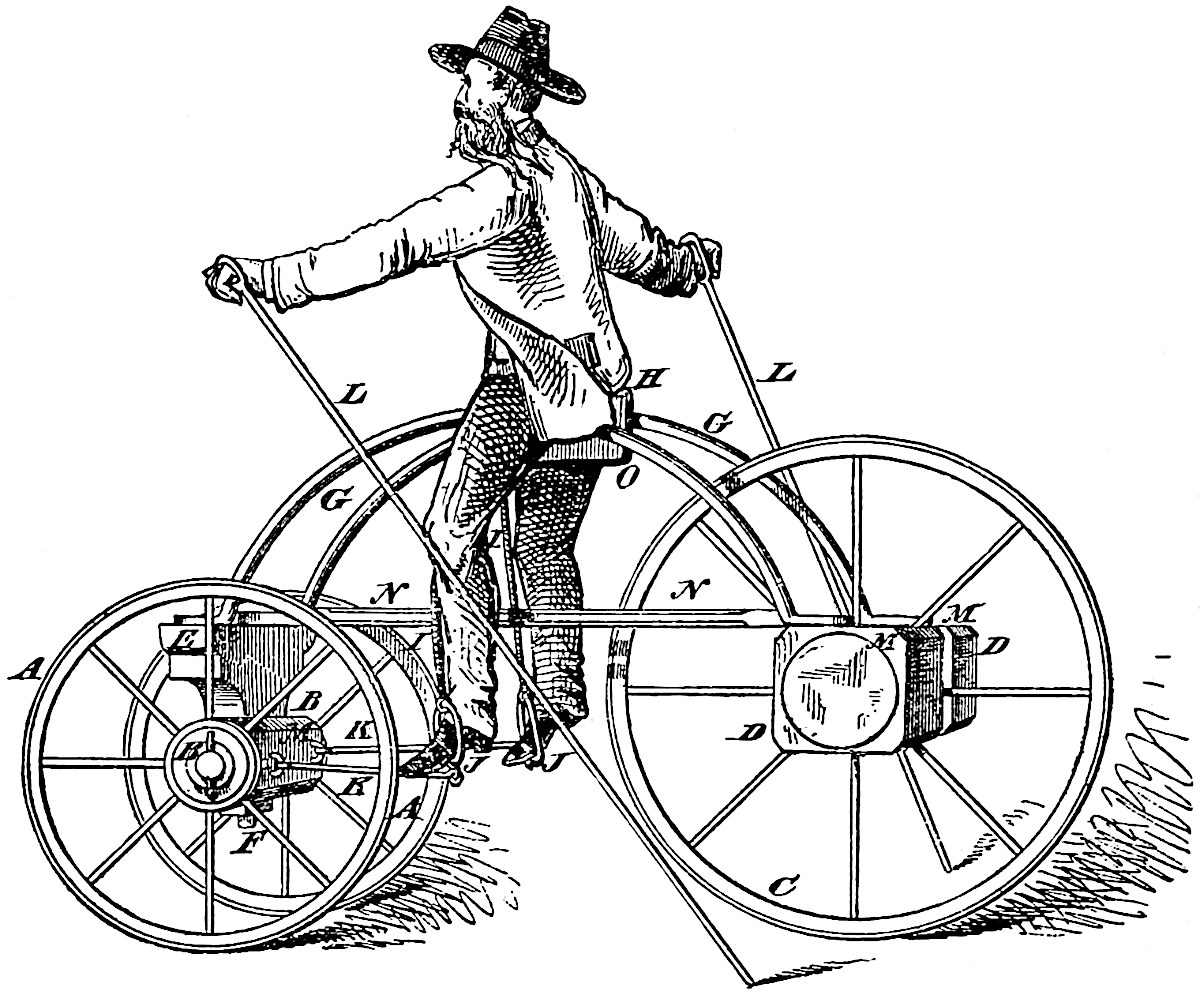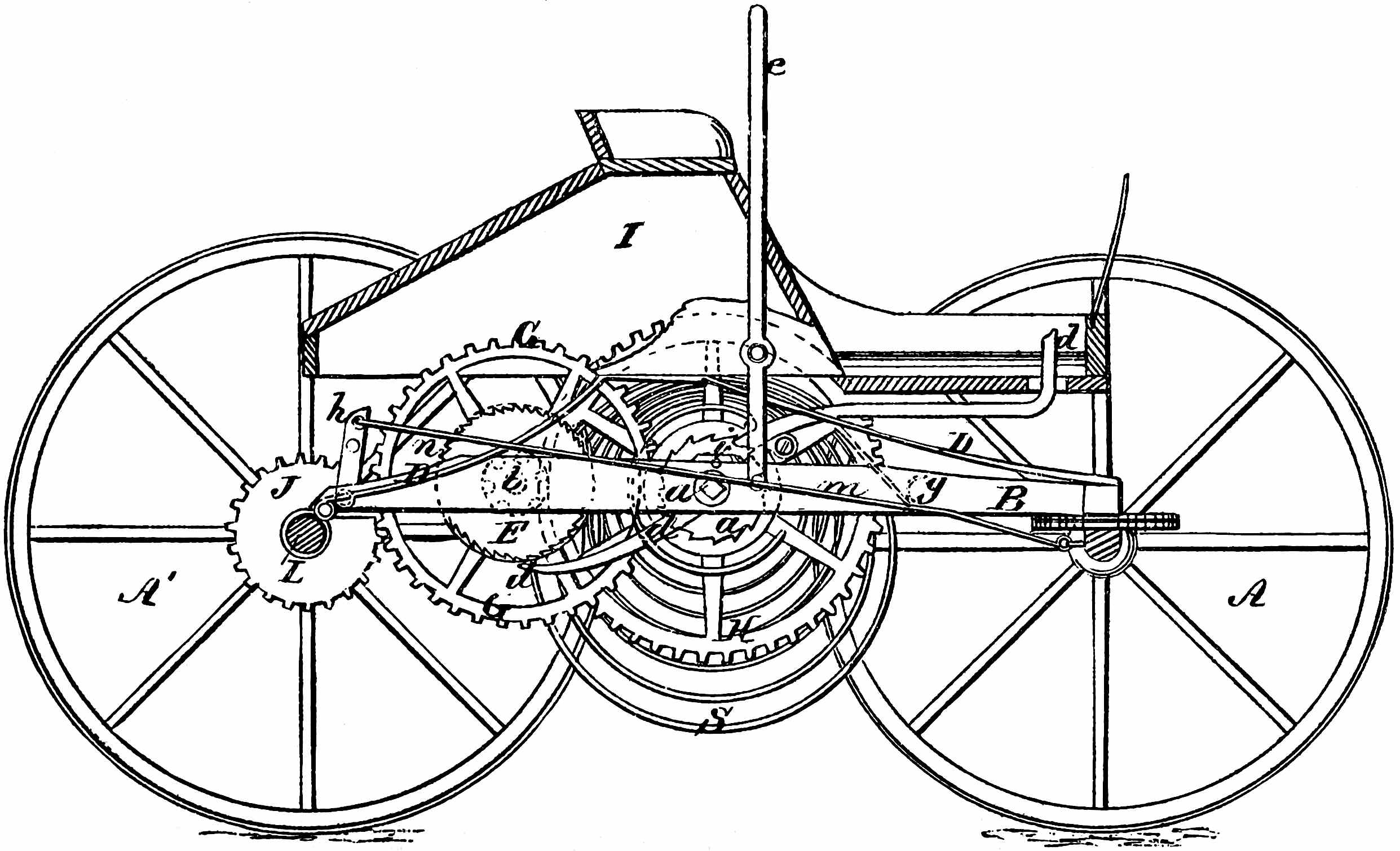 “The shaft-gearing of these spur-wheels consists of impact roller motions, so that the crank centrally on the shaft, within easy reach of the operator upon the seat and between the driving-wheels, may be effectually operated by the hand, and a lever from the guide-wheel is designed to be in such a position as to be within easy reach of the operator’s feet forwardly, so that no difficulty will be encountered, all of which will now be fully set forth.